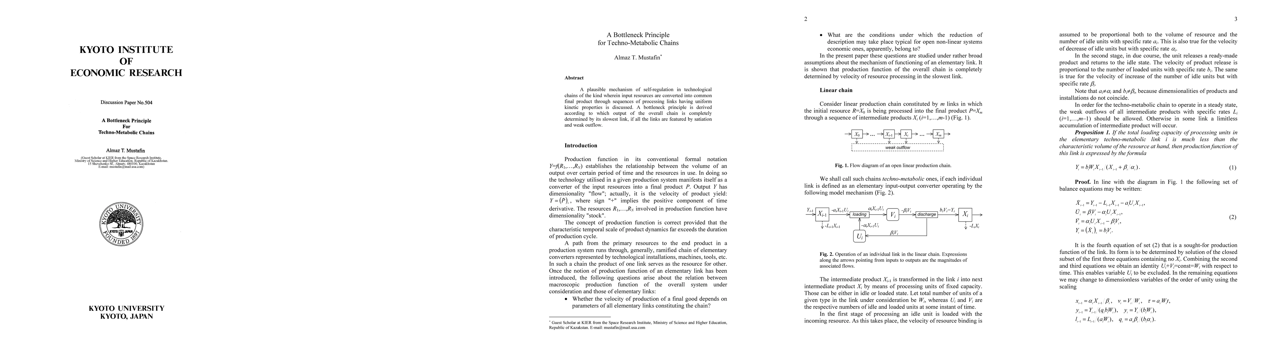 A plausible mechanism of self-regulation in technological chains of the kind wherein input resources are converted into common final product through sequences of processing links having uniform kinetic properties is discussed. A bottleneck principle is derived according to which output of the overall chain is completely determined by its slowest link, if all the links are featured by satiation and weak outflow.