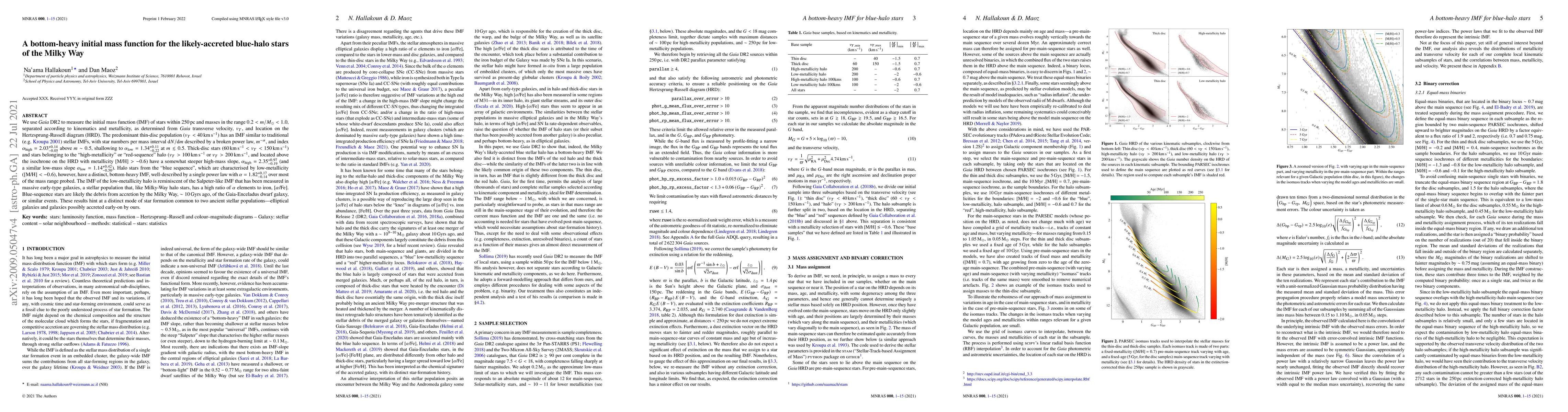 This study uses Gaia DR2 data to analyze the initial mass function (IMF) of Milky Way stars, finding that stars with low metallicity in the "blue halo" exhibit a bottom-heavy IMF, similar to that of massive early-type galaxies, suggesting these stars likely originated from accreted dwarf galaxies. The thin disc stars follow a traditional IMF, while thick disc and high-metallicity halo stars have steeper high-mass slopes.