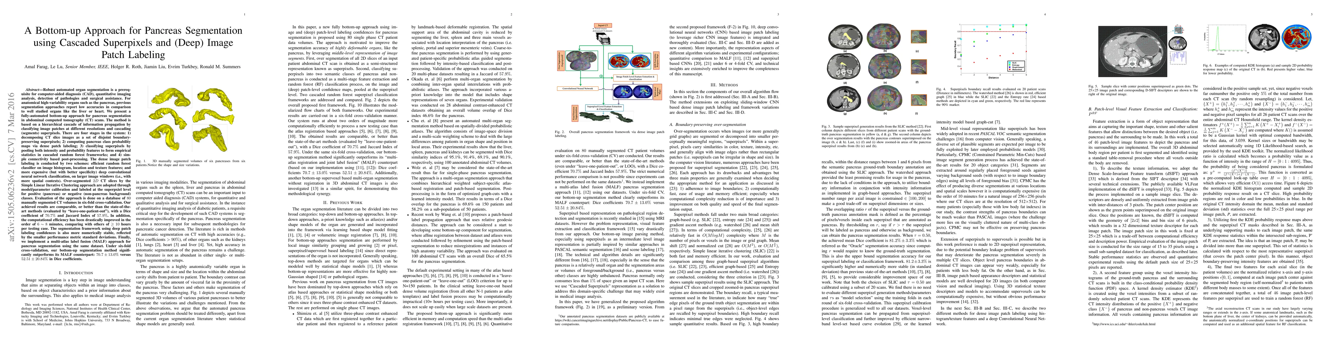 This paper proposes a bottom-up approach for pancreas segmentation in abdominal CT scans using cascaded superpixels and deep image patch labeling. The method achieves high accuracy with improved computational efficiency compared to state-of-the-art techniques, outperforming multi-atlas label fusion counterparts.