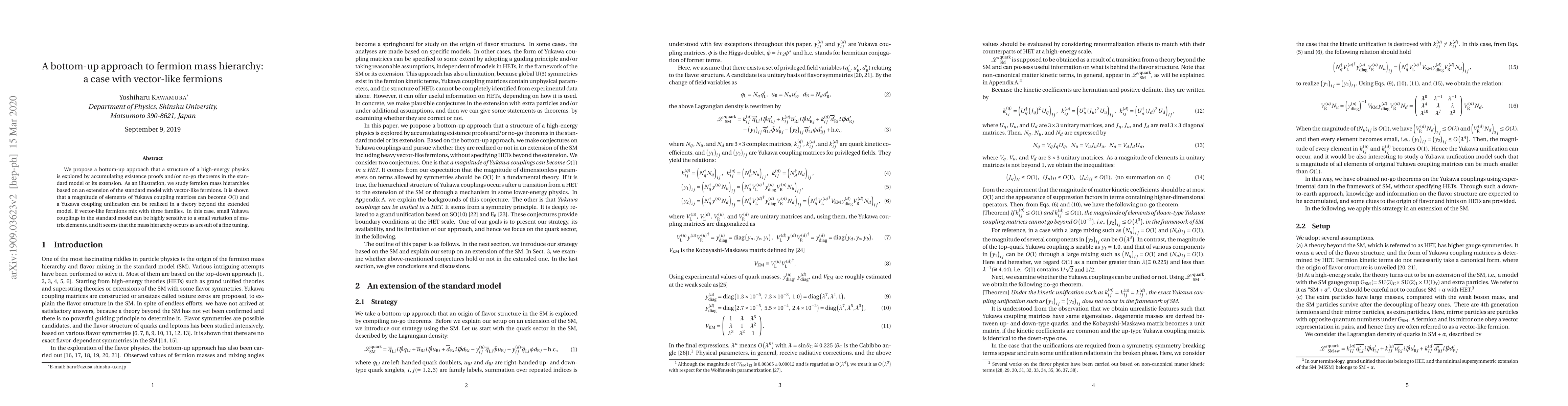We propose a bottom-up approach that a structure of a high-energy physics is explored by accumulating existence proofs and/or no-go theorems in the standard model or its extension. As an illustration, we study fermion mass hierarchies based on an extension of the standard model with vector-like fermions. It is shown that a magnitude of elements of Yukawa coupling matrices can become $O(1)$ and a Yukawa coupling unification can be realized in a theory beyond the extended model, if vector-like fermions mix with three families. In this case, small Yukawa couplings in the standard model can be highly sensitive to a small variation of matrix elements, and it seems that the mass hierarchy occurs as a result of a fine tuning.