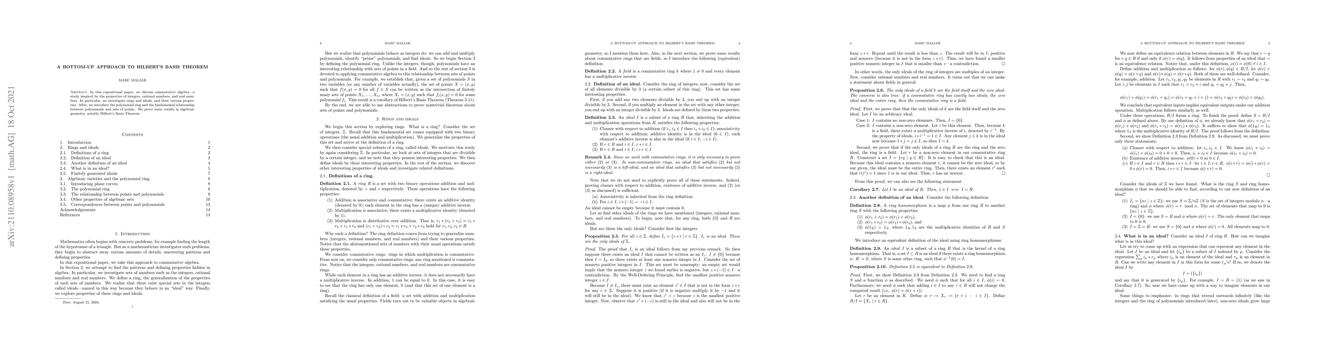This paper explores commutative algebra, focusing on rings, ideals, and polynomial rings, and proves Hilbert's Basis Theorem using a bottom-up approach, linking algebraic properties to geometric interpretations.