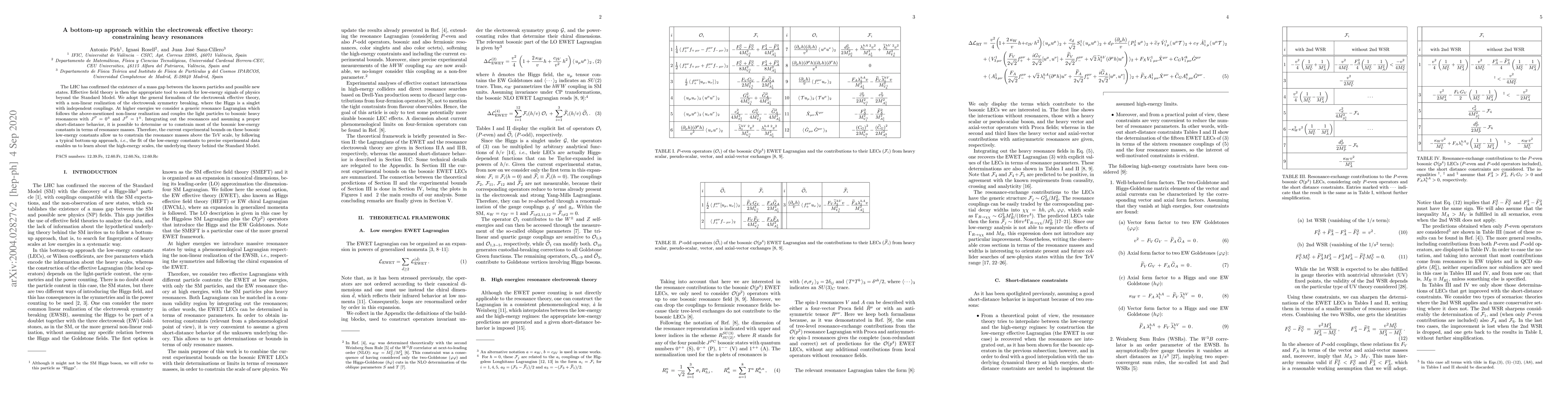This paper employs a bottom-up approach within the electroweak effective theory to constrain heavy resonances. By integrating out high-energy resonances and fitting low-energy constants to experimental data, it determines the masses of bosonic resonances above the TeV scale, thereby probing physics beyond the Standard Model.
