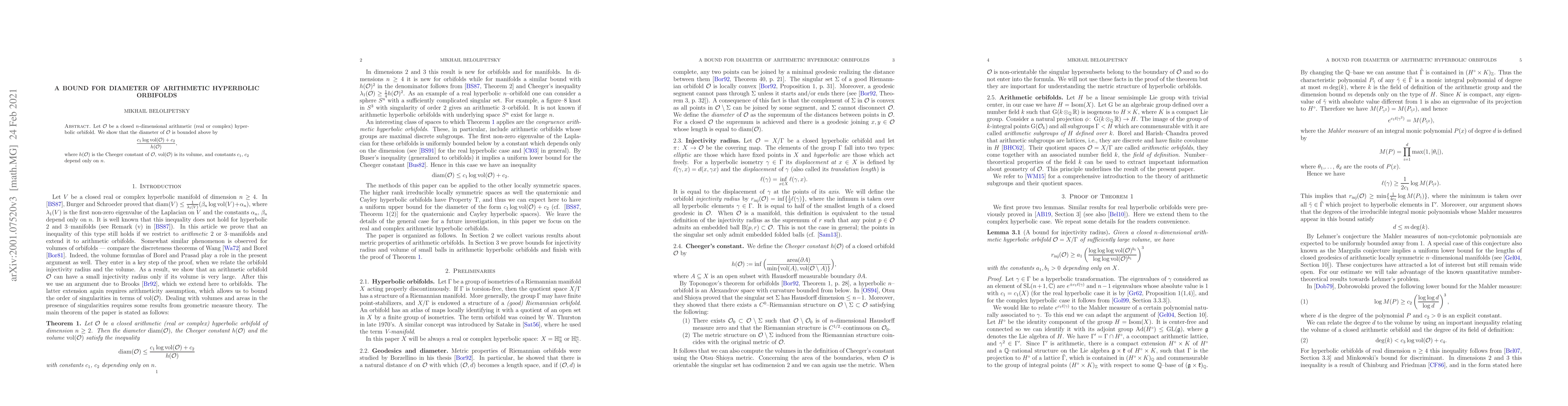 The paper presents a novel bound for the diameter of arithmetic hyperbolic orbifolds in terms of their volume, Cheeger constant, and injectivity radius, extending previous results to the complex hyperbolic case.