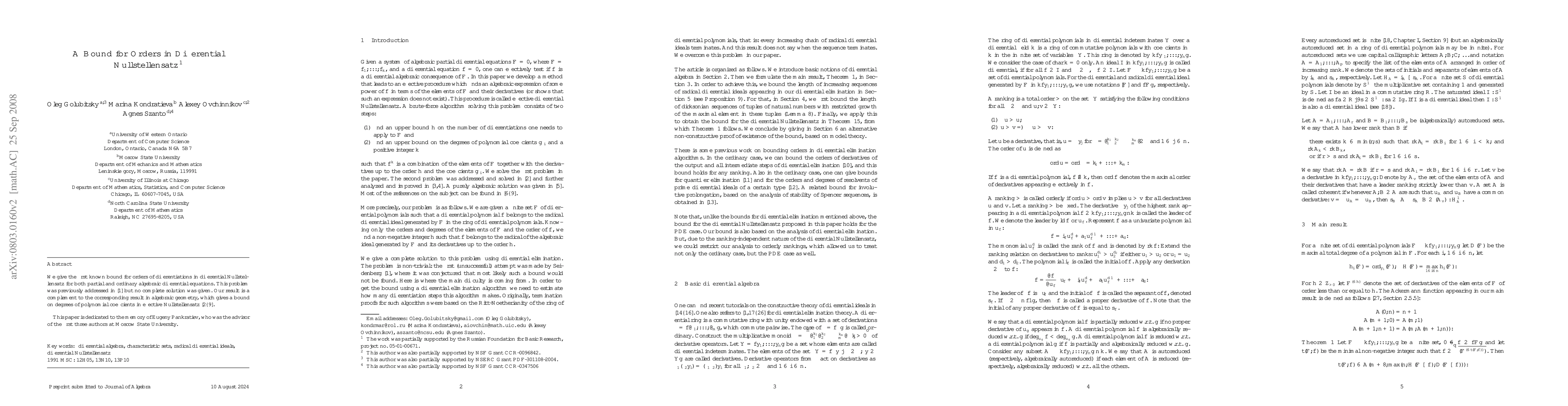 Summary: This paper presents the first known bound for the orders of differentiations in the differential Nullstellensatz for both partial and ordinary algebraic differential equations, addressing a problem left incomplete by A. Seidenberg and complementing the corresponding result in algebraic geometry.