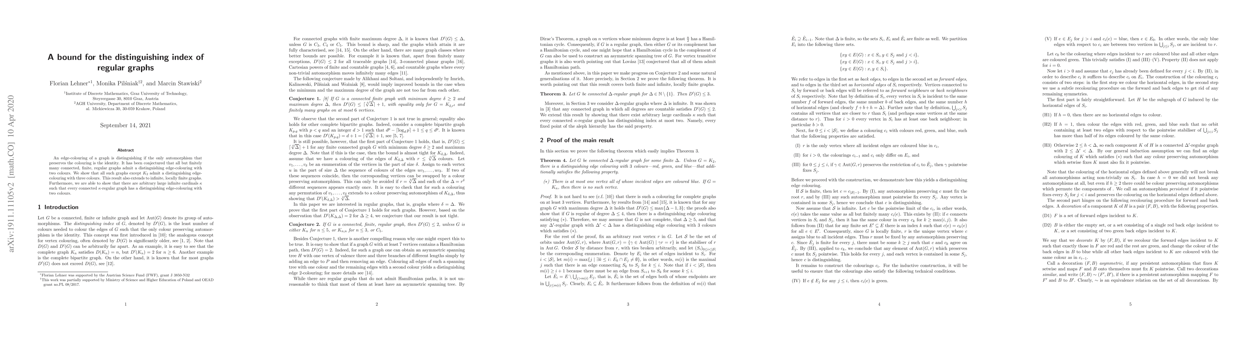 This paper proves that all connected, finite, regular graphs except for $K_2$ can be edge-coloured with three colours to achieve a distinguishing colouring. It also extends this result to infinite, locally finite graphs and shows that large infinite $\kappa$-regular graphs can be edge-coloured with two colours to achieve a distinguishing colouring.