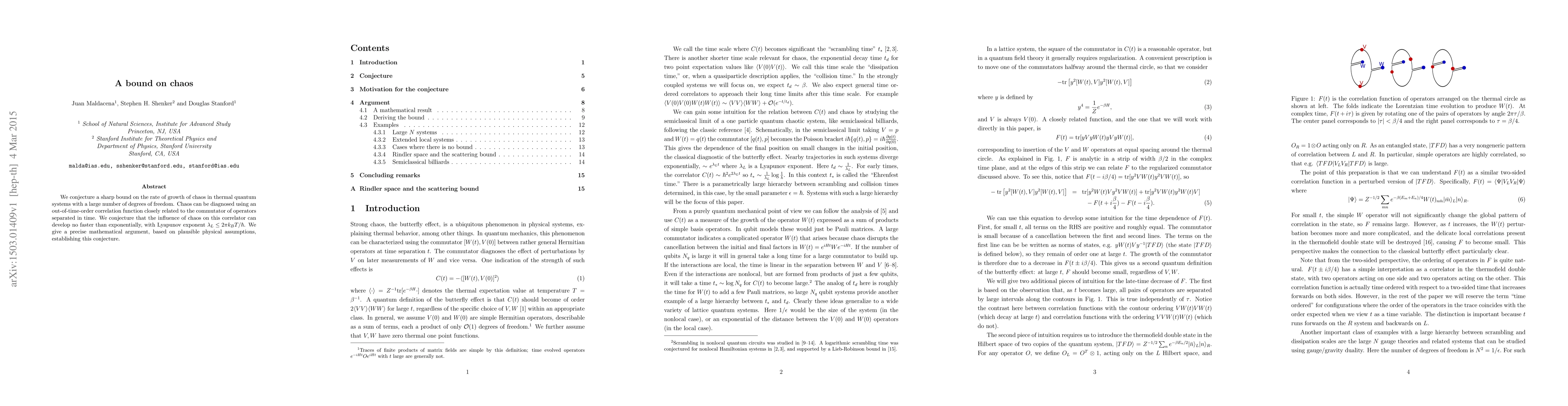 This paper proposes a conjecture that the rate of chaos growth in large thermal quantum systems is bounded by an exponential function, with a Lyapunov exponent $\lambda_L \le 2 \pi k_B T/\hbar$. The authors provide a mathematical argument supporting this conjecture based on physical assumptions.