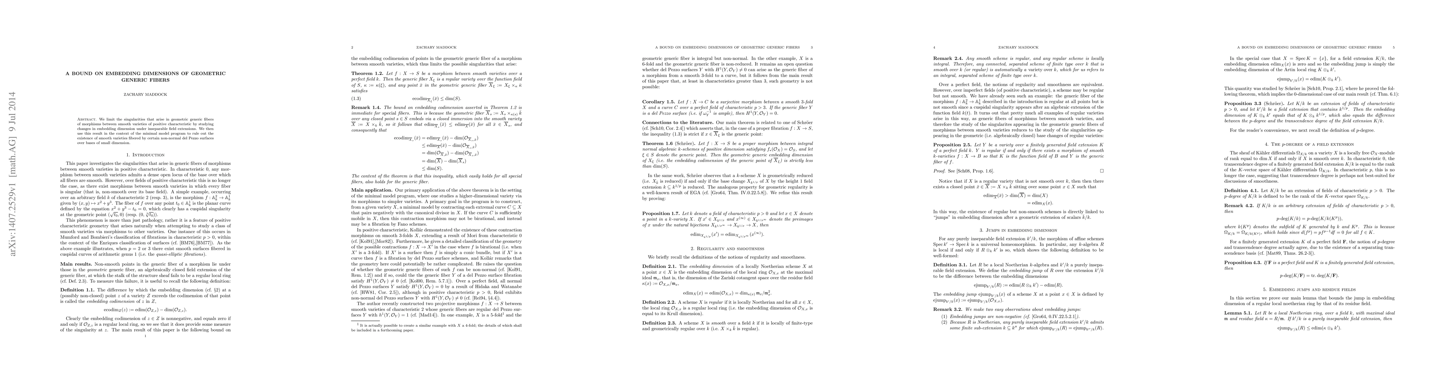 This paper establishes bounds on the embedding dimensions of geometric generic fibers in morphisms between smooth varieties, focusing on singularities under inseparable field extensions. It applies these findings to the minimal model program to demonstrate the non-existence of smooth varieties with specific non-normal del Pezzo surfaces as fibers over low-dimensional bases.