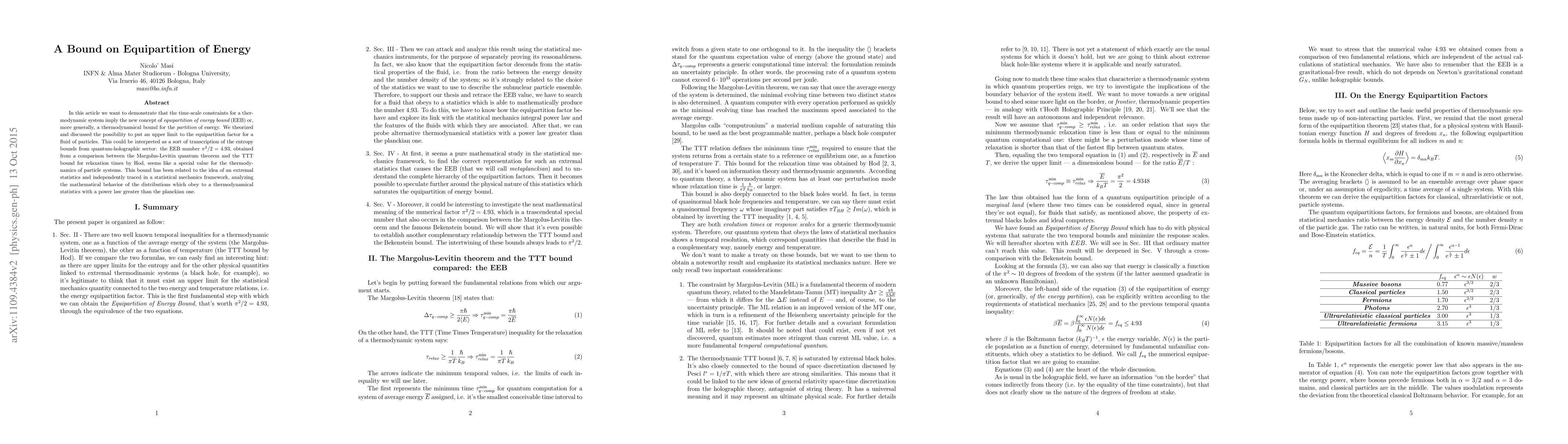 In this article we want to demonstrate that the time-scale constraints for a thermodynamic system imply the new concept of {\it equipartition of energy bound} (EEB) or, more generally, a thermodynamical bound for the {\it partition} of energy. We theorized and discussed the possibility to put an upper limit to the equipartition factor for a fluid of particles. This could be interpreted as a sort of transcription of the entropy bounds from quantum-holographic sector: the EEB number $\pi^{2}/2 = 4.93$, obtained from a comparison between the Margolus-Levitin quantum theorem and the TTT bound for relaxation times by Hod, seems like a special value for the thermodynamics of particle systems. This bound has been related to the idea of an extremal statistics and independently traced in a statistical mechanics framework, analyzing the mathematical behavior of the distributions which obey to a thermodynamical statistics with a power law greater than the planckian one.