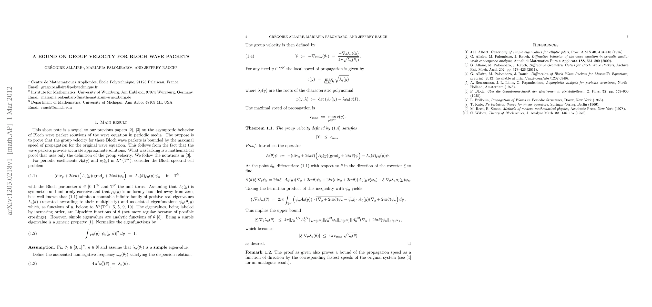 This short note is a sequel to our previous papers on the asymptotic behavior of Bloch wave packet solutions of the wave equation in periodic media. The purpose is to prove that the group velocity for these Bloch wave packets is bounded by the maximal speed of propagation for the original wave equation.