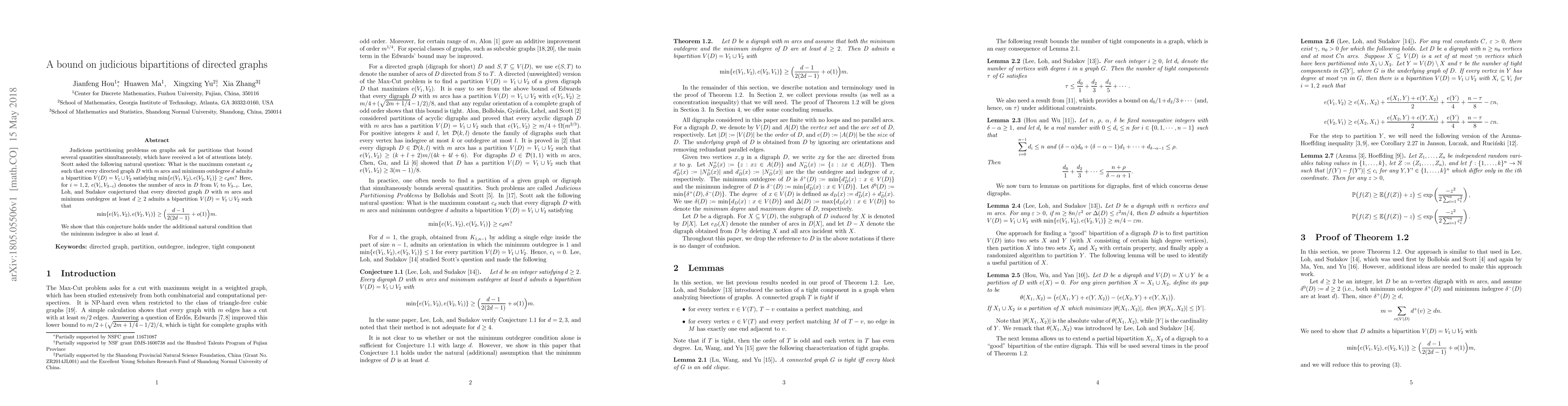 Judicious partitioning problems on graphs ask for partitions that bound several quantities simultaneously, which have received a lot of attentions lately. Scott asked the following natural question: What is the maximum constant $c_d$ such that every directed graph $D$ with $m$ arcs and minimum outdegree $d$ admits a bipartition $V(D)= V_1\cup V_2$ satisfying $\min\{e(V_1, V_2), e(V_2, V_1)\}\ge c_d m$? Here, for $i=1,2$, $e(V_{i},V_{3-i})$ denotes the number of arcs in $D$ from $V_{i}$ to $V_{3-i}$. Lee, Loh, and Sudakov %[Judicious partitions of directed graphs, Random Struct. Alg. 48 %(2016) 147--170] conjectured that every directed graph $D$ with $m$ arcs and minimum outdegree at least $d\ge 2$ admits a bipartition $V(D)=V_1\cup V_2$ such that \[ \min\{e(V_1,V_2),e(V_2,V_1)\}\geq \Big(\frac{d-1}{2(2d-1)}+ o(1)\Big)m. \] %While it is not known whether or not the minimum outdegree condition %alone is sufficient, w We show that this conjecture holds under the additional natural condition that the minimum indegree is also at least $d$.