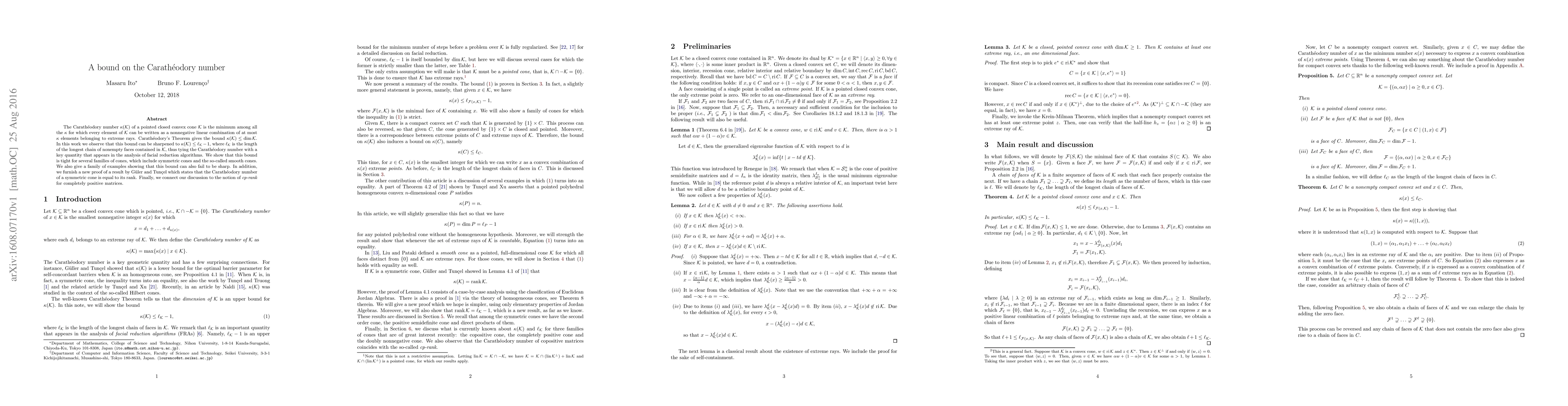 The Carath\'eodory number k(K) of a pointed closed convex cone K is the minimum among all the k for which every element of K can be written as a nonnegative linear combination of at most k elements belonging to extreme rays. Carath\'eodory's Theorem gives the bound k(K) <= dim (K). In this work we observe that this bound can be sharpened to k(K) <= l-1, where l is the length of the longest chain of nonempty faces contained in K, thus tying the Carath\'eodory number with a key quantity that appears in the analysis of facial reduction algorithms. We show that this bound is tight for several families of cones, which include symmetric cones and the so-called smooth cones. We also give a family of examples showing that this bound can also fail to be sharp. In addition, we furnish a new proof of a result by G\"uler and Tun\c{c}el which states that the Carath\'eodory number of a symmetric cone is equal to its rank. Finally, we connect our discussion to the notion of cp-rank for completely positive matrices.
