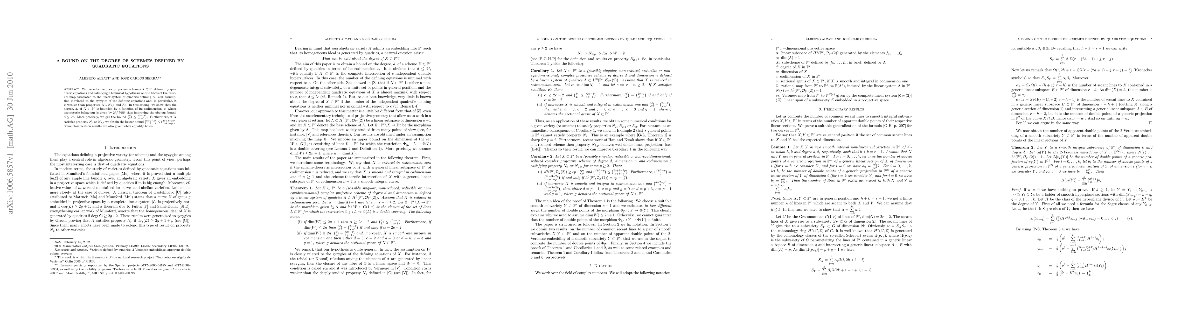 We consider complex projective schemes $X\subset\Bbb{P}^{r}$ defined by quadratic equations and satisfying a technical hypothesis on the fibres of the rational map associated to the linear system of quadrics defining $X$. Our assumption is related to the syzygies of the defining equations and, in particular, it is weaker than properties $N_2$, $N_{2,2}$ and $K_2$. In this setting, we show that the degree, $d$, of $X\subset\Bbb{P}^{r}$ is bounded by a function of its codimension, $c$, whose asymptotic behaviour is given by ${2^c}/{\sqrt[4]{\pi c}}$, thus improving the obvious bound $d\leq 2^c$. More precisely, we get the bound $\binom{d}{2}\leq\binom{2c-1}{c-1}$. Furthermore, if $X$ satisfies property $N_p$ or $N_{2,p}$ we obtain the better bound $\binom{d+2-p}{2}\leq\binom{2c+3-2p}{c+1-p}$. Some classification results are also given when equality holds.