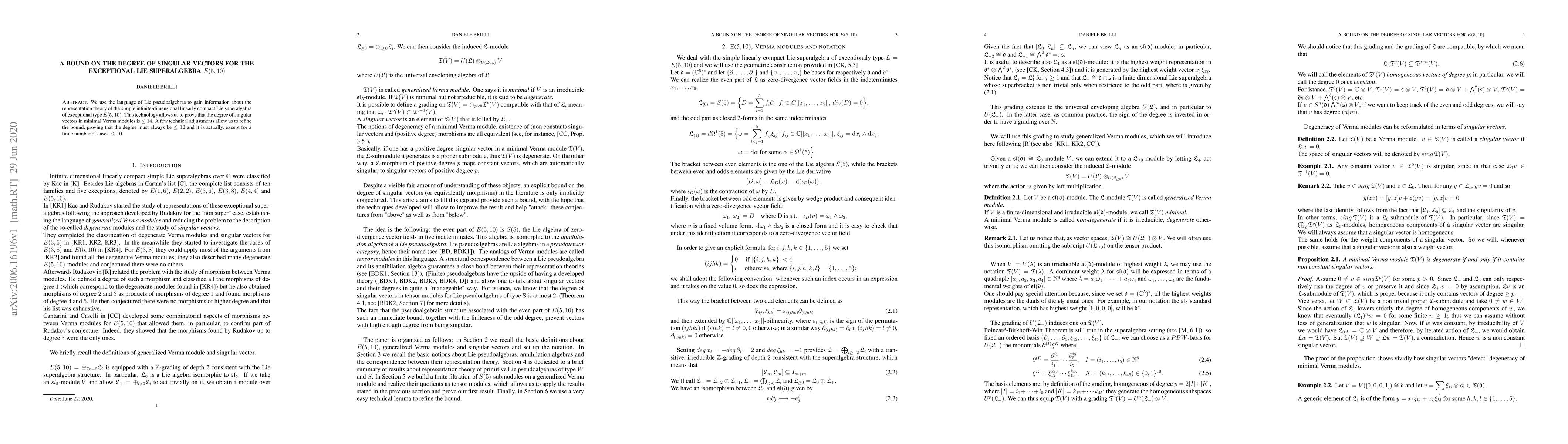 Researchers bound the degree of singular vectors in minimal Verma modules for the Lie superalgebra E(5,10) to 12, with most cases having a degree of 10.