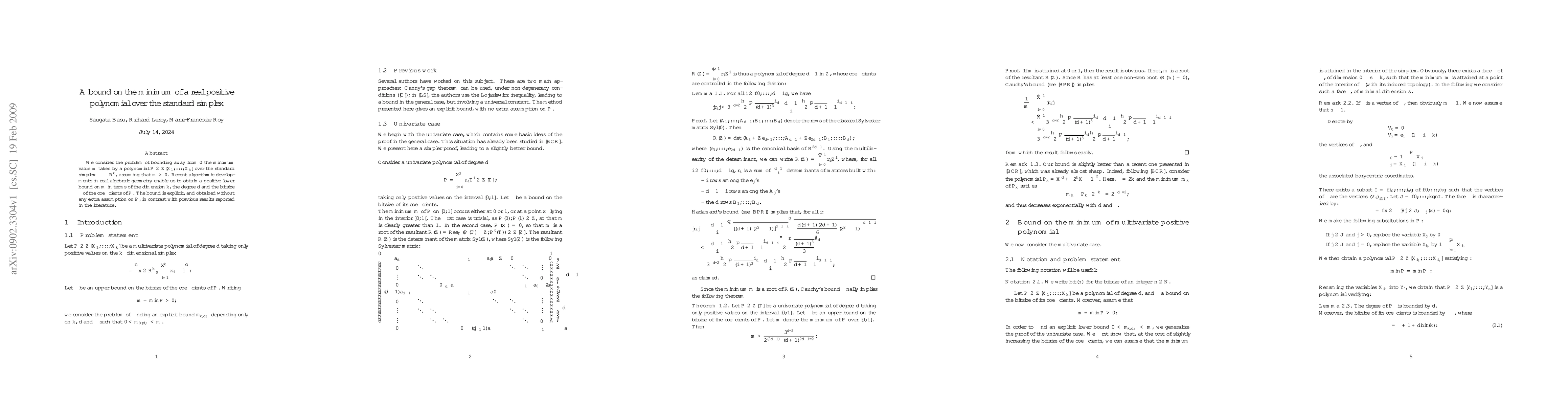 Researchers have found a way to bound away from 0 the minimum value of a real positive polynomial over a complex geometric shape called the standard simplex, using advanced algebraic geometry techniques. The bound is explicit and depends on the polynomial's degree, dimension, and coefficient size.