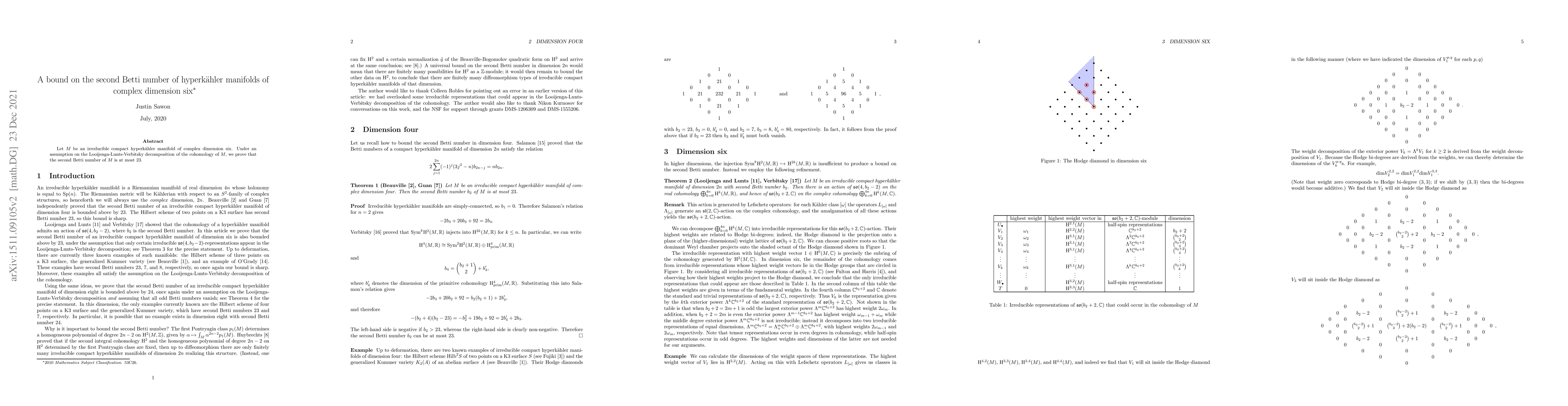 Summary: This paper proves that the second Betti number of an irreducible compact hyperkähler manifold of complex dimension six is at most 23, under a specific assumption on the cohomology decomposition. The result hinges on the Looijenga-Lunts-Verbitsky structure of the manifold's cohomology.