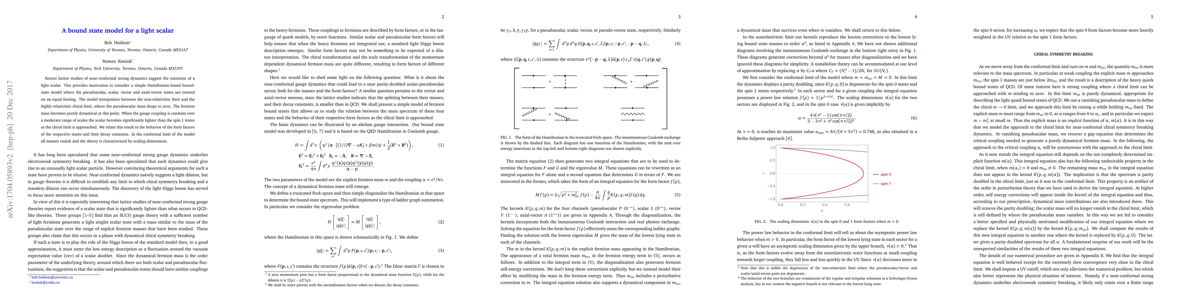Recent lattice studies of near-conformal strong dynamics suggest the existence of a light scalar. This provides motivation to consider a simple Hamiltonian-based bound-state model where the pseudoscalar, scalar, vector and axial-vector states are treated on an equal footing. The model interpolates between the non-relativistic limit and the highly relativistic chiral limit, where the pseudoscalar mass drops to zero. The fermion mass becomes purely dynamical at this point. When the gauge coupling is constant over a moderate range of scales the scalar becomes significantly lighter than the spin 1 states as the chiral limit is approached. We relate this result to the behavior of the form factors of the respective states and their decay constants. In the conformal limit of the model all masses vanish and the theory is characterized by scaling dimensions.