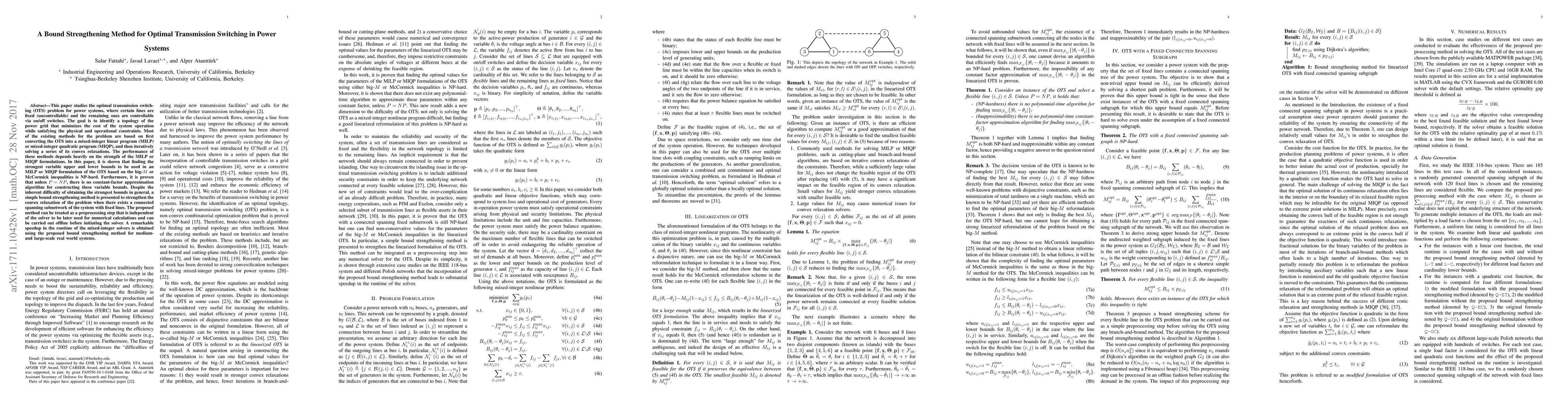 This paper studies the optimal transmission switching (OTS) problem for power systems, where certain lines are fixed (uncontrollable) and the remaining ones are controllable via on/off switches. The goal is to identify a topology of the power grid that minimizes the cost of the system operation while satisfying the physical and operational constraints. Most of the existing methods for the problem are based on first converting the OTS into a mixed-integer linear program (MILP) or mixed-integer quadratic program (MIQP), and then iteratively solving a series of its convex relaxations. The performance of these methods depends heavily on the strength of the MILP or MIQP formulations. In this paper, it is shown that finding the strongest variable upper and lower bounds to be used in an MILP or MIQP formulation of the OTS based on the big-$M$ or McCormick inequalities is NP-hard. Furthermore, it is proven that unless P=NP, there is no constant-factor approximation algorithm for constructing these variable bounds. Despite the inherent difficulty of obtaining the strongest bounds in general, a simple bound strengthening method is presented to strengthen the convex relaxation of the problem when there exists a connected spanning subnetwork of the system with fixed lines. The proposed method can be treated as a preprocessing step that is independent of the solver to be later used for numerical calculations and can be carried out offline before initiating the solver. A remarkable speedup in the runtime of the mixed-integer solvers is obtained using the proposed bound strengthening method for medium- and large-scale real-world systems.