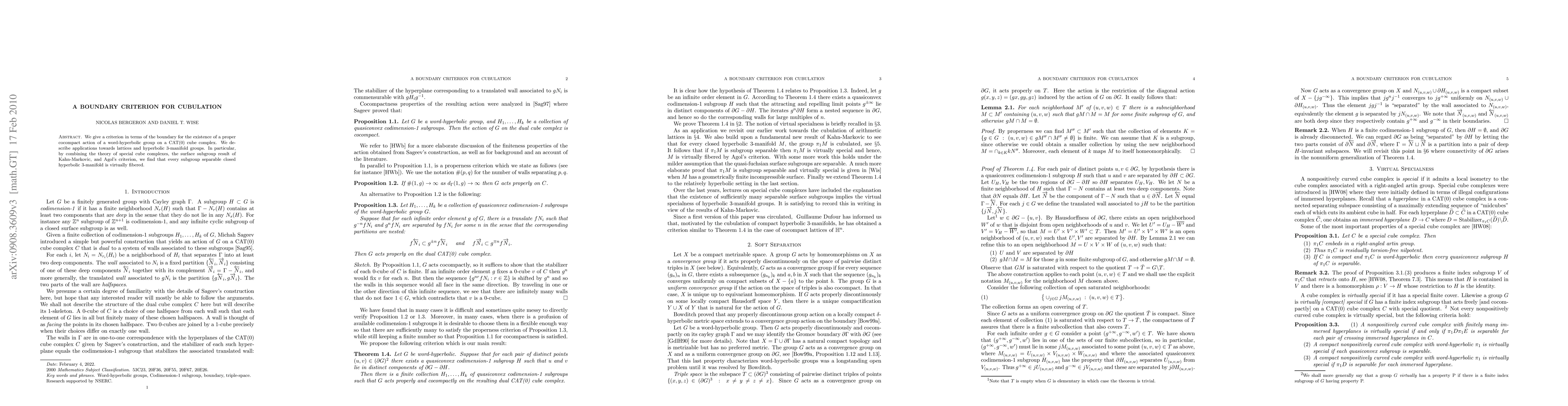 This paper provides a boundary-based criterion for the existence of a cocompact action of word-hyperbolic groups on CAT(0) cube complexes, with applications to lattices and hyperbolic 3-manifold groups, leading to the conclusion that every subgroup separable closed hyperbolic 3-manifold is virtually fibered.