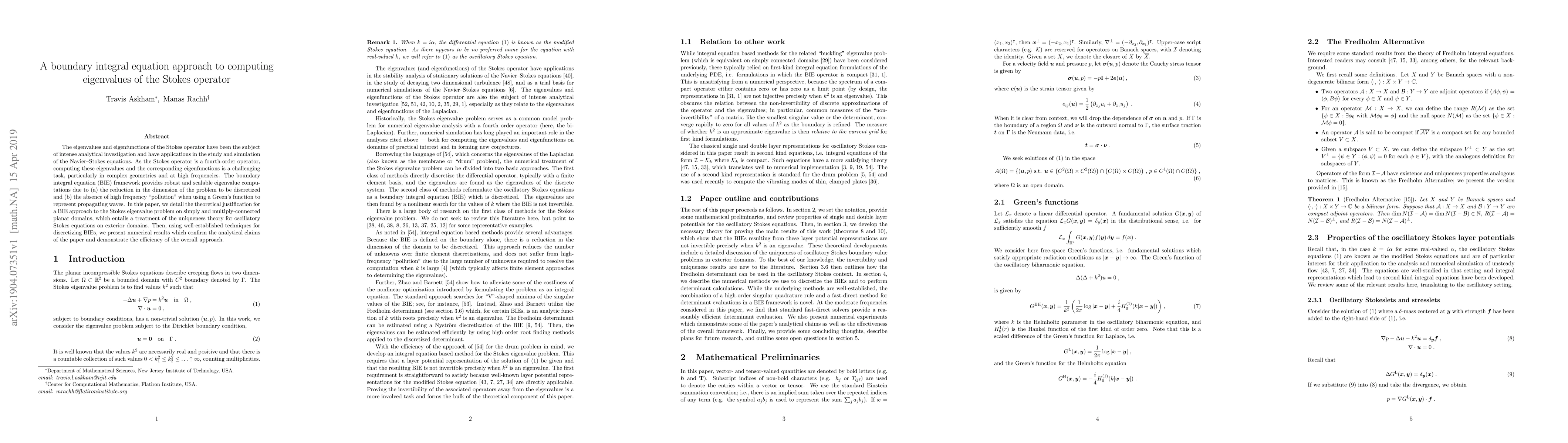This paper proposes a boundary integral equation (BIE) method for computing eigenvalues of the Stokes operator, emphasizing its efficiency and scalability in complex geometries. The BIE approach reduces problem dimensionality and avoids high-frequency issues, providing robust numerical results validated through discretization techniques and numerical experiments.