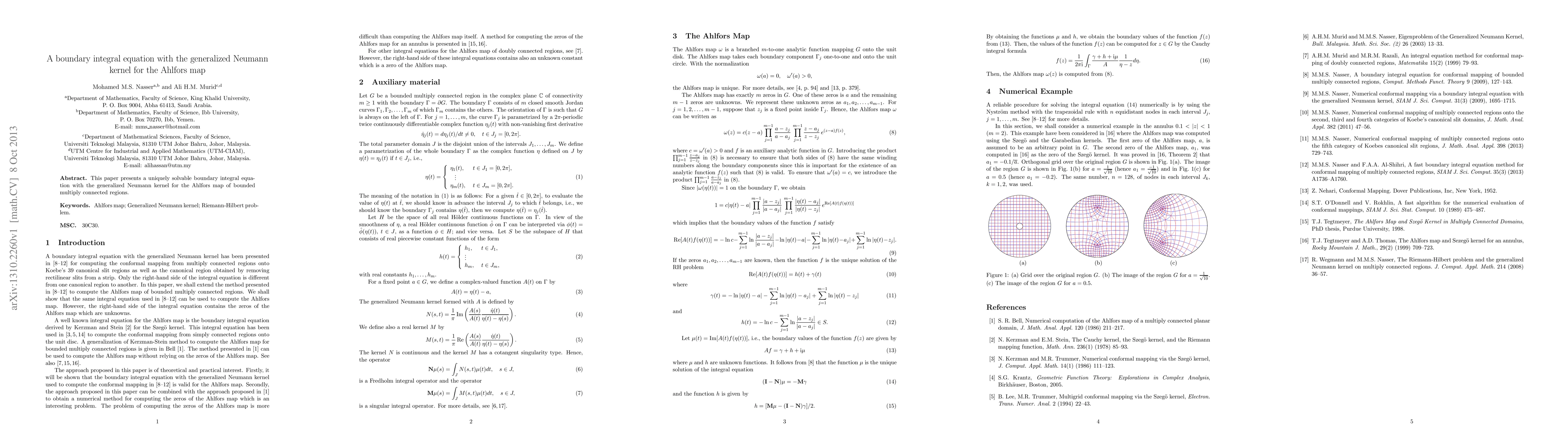 Summary: This paper introduces a uniquely solvable boundary integral equation using the generalized Neumann kernel for determining the Ahlfors map of bounded, multiply connected regions. The method provides a robust framework for analyzing complex geometric transformations.
