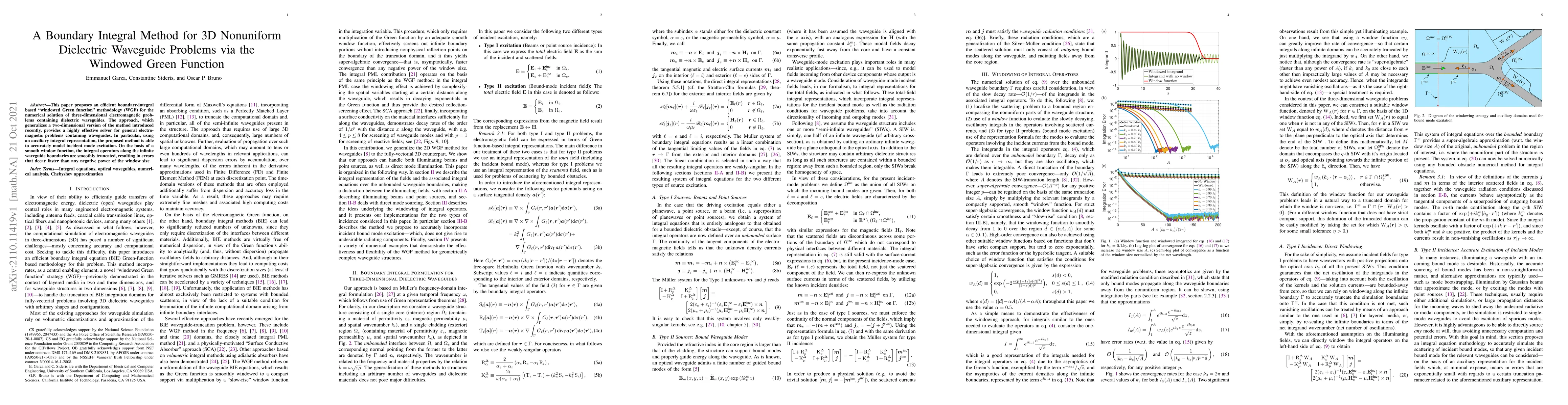 This paper introduces a boundary-integral method using a "windowed Green function" (WGF) for solving 3D electromagnetic problems involving nonuniform dielectric waveguides. The method efficiently models incident mode excitation and achieves faster error decay than traditional approaches.