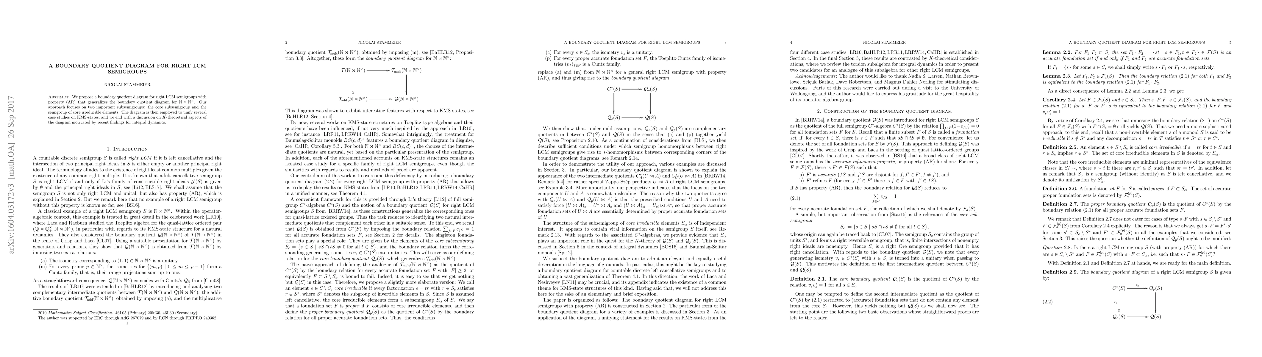 We propose a boundary quotient diagram for right LCM semigroups with property (AR) that generalizes the boundary quotient diagram for the $ax+b$-semigroup over the natural numbers. Our approach focuses on two important subsemigroups: the core subsemigroup and the semigroup of core irreducible elements. The diagram is then employed to unify several case studies on KMS-states, and we end with a discussion on $K$-theoretical aspects of the diagram motivated by recent findings for integral dynamics.