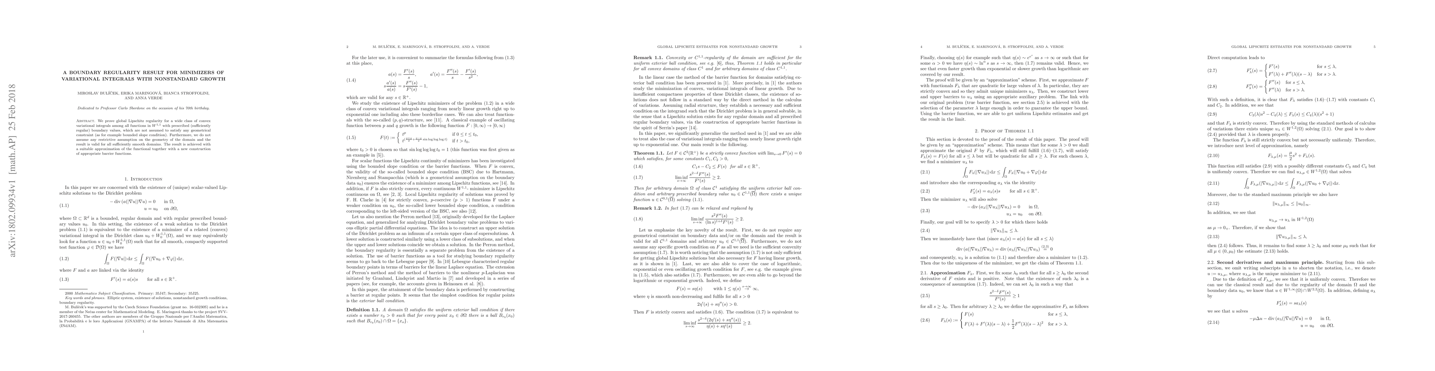 We prove global Lipschitz regularity for a wide class of convex variational integrals among all functions in $W^{1,1}$ with prescribed (sufficiently regular) boundary values, which are not assumed to satisfy any geometrical constraint (as for example bounded slope condition). Furthermore, we do not assume any restrictive assumption on the geometry of the domain and the result is valid for all sufficiently smooth domains. The result is achieved with a suitable approximation of the functional together with a new construction of appropriate barrier functions.