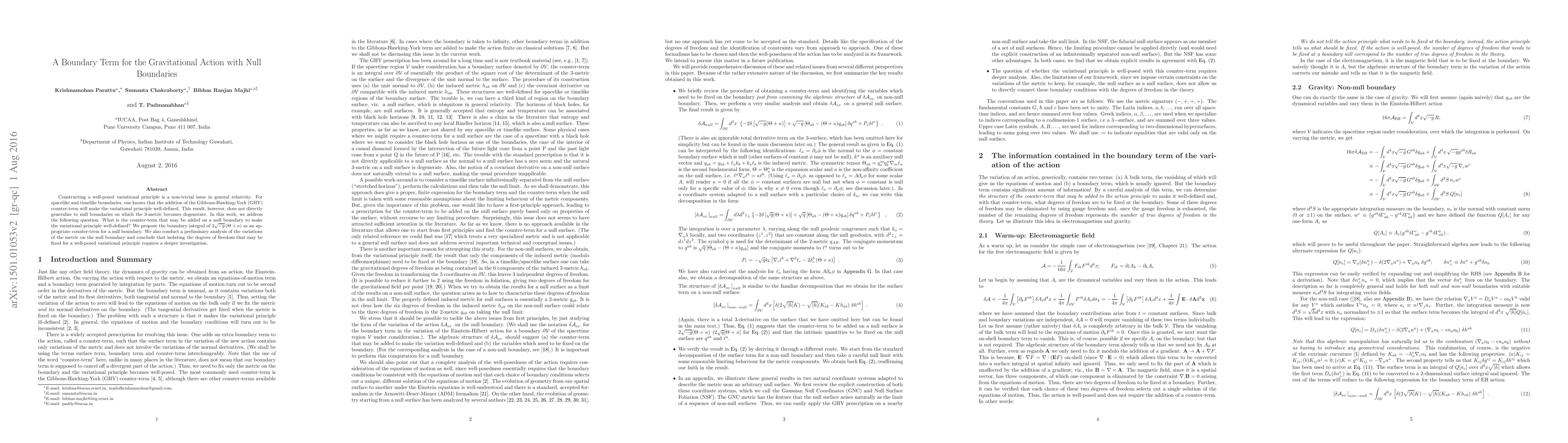 Constructing a well-posed variational principle is a non-trivial issue in general relativity. For spacelike and timelike boundaries, one knows that the addition of the Gibbons-Hawking-York (GHY) counter-term will make the variational principle well-defined. This result, however, does not directly generalize to null boundaries on which the 3-metric becomes degenerate. In this work, we address the following question: What is the counter-term that may be added on a null boundary to make the variational principle well-defined? We propose the boundary integral of $2 \sqrt{-g} \left( \Theta+\kappa \right)$ as an appropriate counter-term for a null boundary. We also conduct a preliminary analysis of the variations of the metric on the null boundary and conclude that isolating the degrees of freedom that may be fixed for a well-posed variational principle requires a deeper investigation.