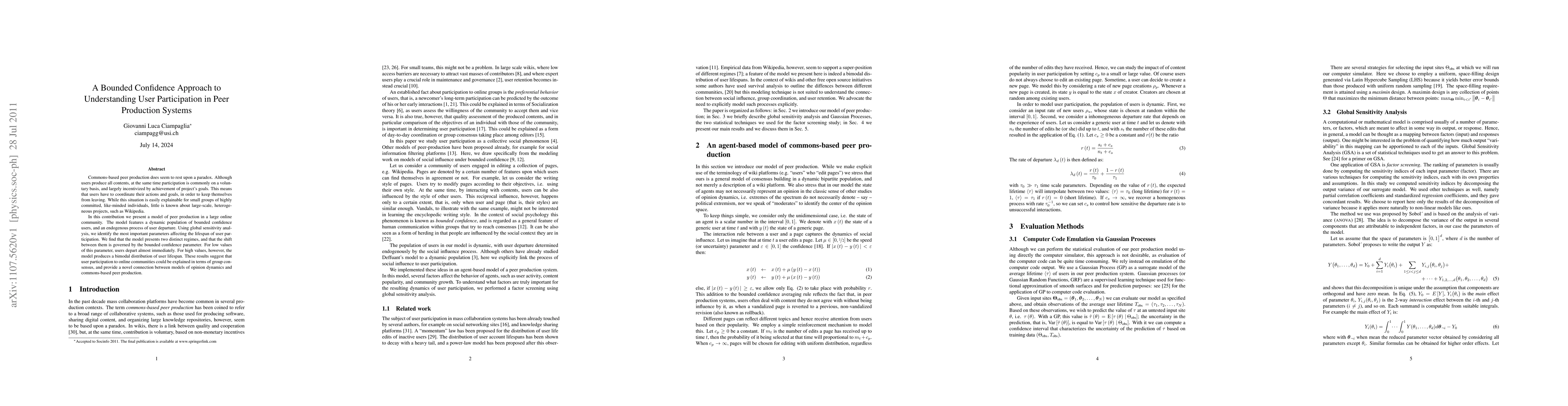 Commons-based peer production does seem to rest upon a paradox. Although users produce all contents, at the same time participation is commonly on a voluntary basis, and largely incentivized by achievement of project's goals. This means that users have to coordinate their actions and goals, in order to keep themselves from leaving. While this situation is easily explainable for small groups of highly committed, like-minded individuals, little is known about large-scale, heterogeneous projects, such as Wikipedia. In this contribution we present a model of peer production in a large online community. The model features a dynamic population of bounded confidence users, and an endogenous process of user departure. Using global sensitivity analysis, we identify the most important parameters affecting the lifespan of user participation. We find that the model presents two distinct regimes, and that the shift between them is governed by the bounded confidence parameter. For low values of this parameter, users depart almost immediately. For high values, however, the model produces a bimodal distribution of user lifespan. These results suggest that user participation to online communities could be explained in terms of group consensus, and provide a novel connection between models of opinion dynamics and commons-based peer production.
