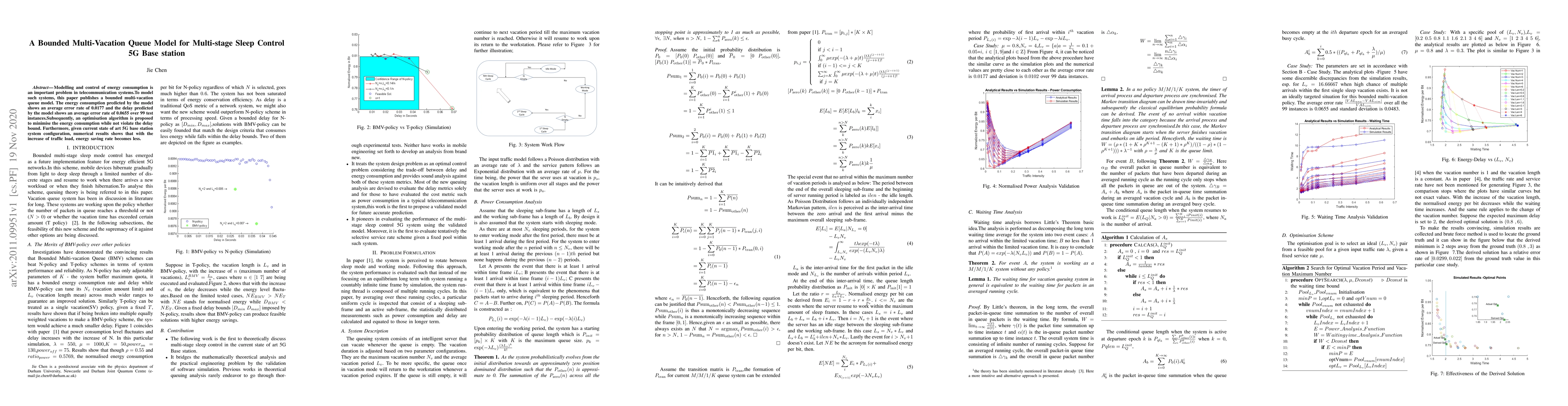 Modelling and control of energy consumption is an important problem in telecommunication systems.To model such systems, this paper publishes a bounded multi-vacation queue model. The energy consumption predicted by the model shows an average error rate of 0.0177 and the delay predicted by the model shows an average error rate of 0.0655 over 99 test instances.Subsequently, an optimization algorithm is proposed to minimize the energy consumption while not violate the delay bound. Furthermore, given current state of art 5G base station system configuration, numerical results shows that with the increase of traffic load, energy saving rate becomes less.