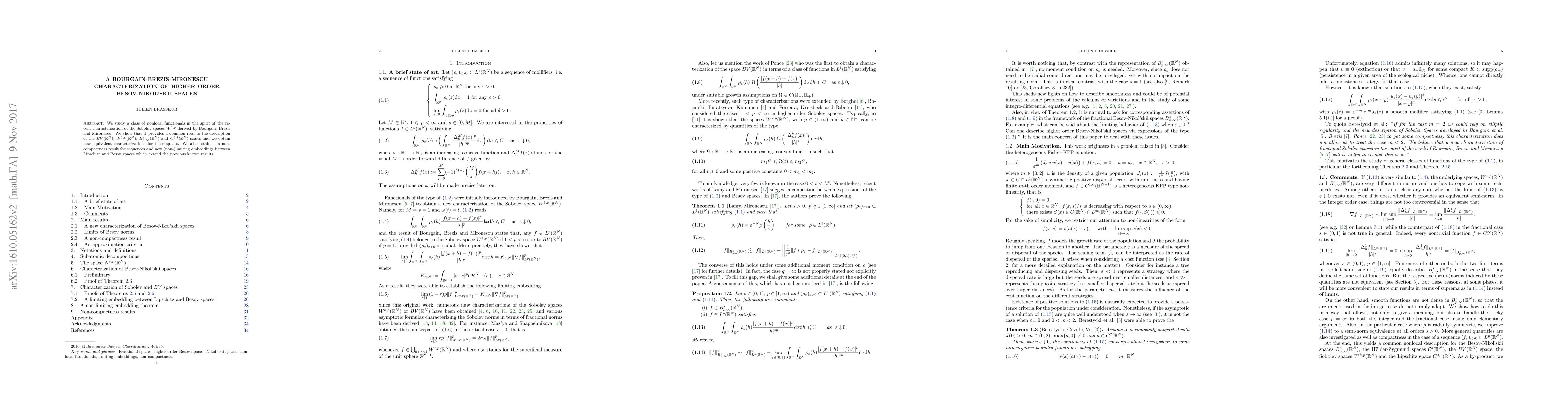 We study a class of nonlocal functionals in the spirit of the recent characterization of the Sobolev spaces $W^{1,p}$ derived by Bourgain, Brezis and Mironescu. We show that it provides a common roof to the description of the $BV(\mathbb{R}^N)$, $W^{1,p}(\mathbb{R}^N)$, $B_{p,\infty}^s(\mathbb{R}^N)$ and $C^{0,1}(\mathbb{R}^N)$ scales and we obtain new equivalent characterizations for these spaces. We also establish a non-compactness result for sequences and new (non-)limiting embeddings between Lipschitz and Besov spaces which extend the previous known results.