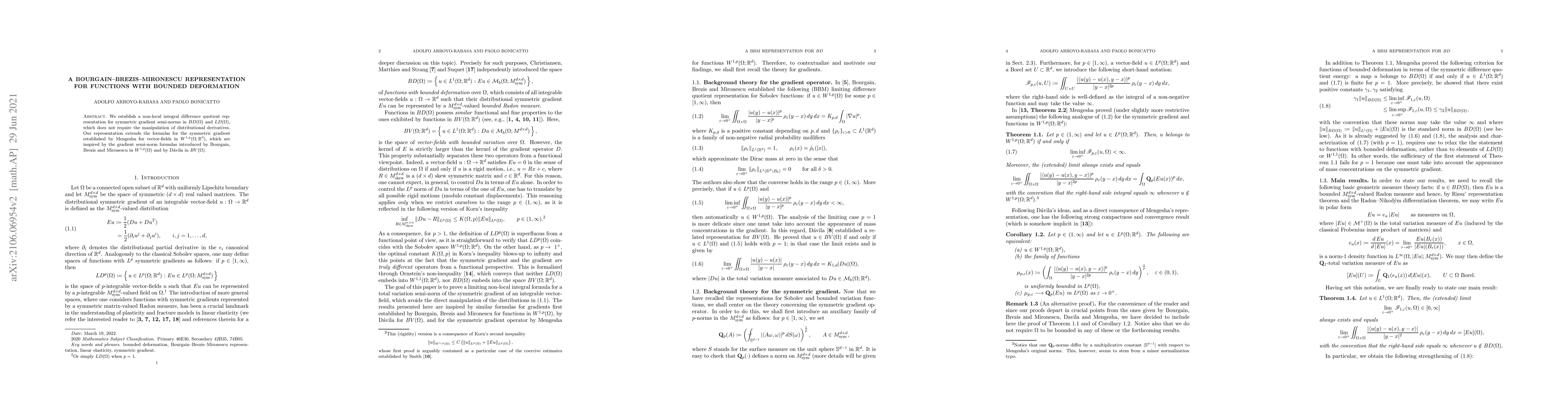 We establish a non-local integral difference quotient representation for symmetric gradient semi-norms in $BD(\Omega)$ and $LD(\Omega)$, which does not require the manipulation of distributional derivatives. Our representation extends the formulas for the symmetric gradient established by Mengesha for vector-fields in $W^{1,p}(\Omega;\mathbb R^d)$, which are inspired by the gradient semi-norm formulas introduced by Bourgain, Brezis and Mironescu in $W^{1,p}(\Omega)$ and by D\'avila in $BV(\Omega)$.