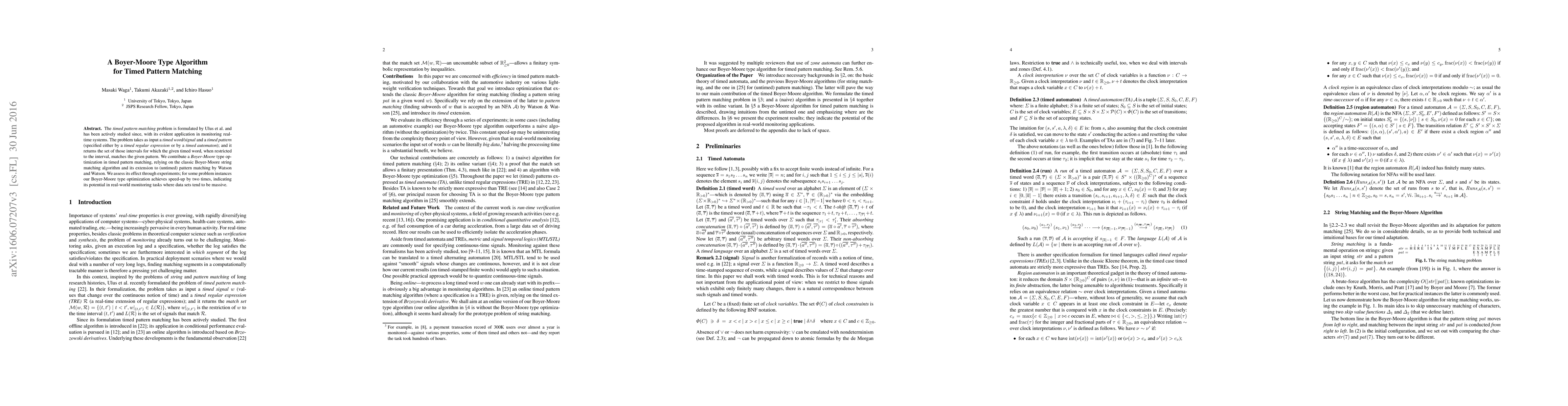 This paper presents a Boyer-Moore type algorithm for optimizing timed pattern matching, achieving up to twice the speed compared to existing methods. The approach leverages the classic Boyer-Moore string matching algorithm and demonstrates its effectiveness in real-time system monitoring tasks.