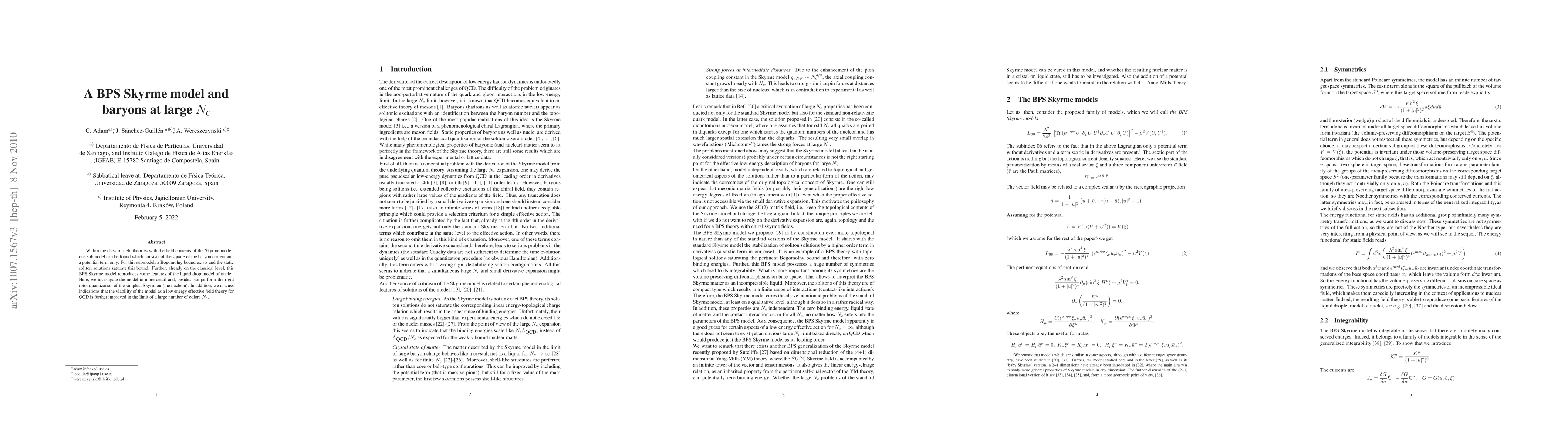 The paper explores a BPS Skyrme model, a submodel of Skyrme model field theories, which exhibits a Bogomolny bound and classical soliton solutions saturating it. The model's rigid rotor quantization of the simplest Skyrmion (nucleon) is investigated. The study suggests that the model's suitability as a low energy effective field theory for QCD improves with a large number of colors (Nc).