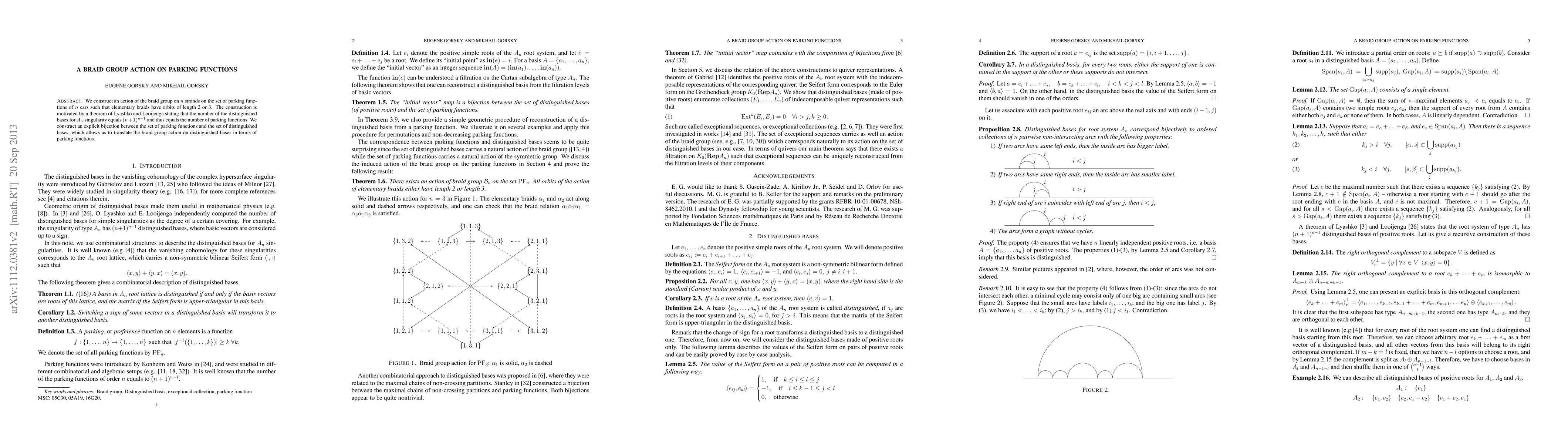 This research paper introduces an action of the braid group on n strands on parking functions, where elementary braids result in orbits of length 2 or 3. The construction leverages a bijection between parking functions and distinguished bases of An singularities, facilitating translation of braid group actions between these two mathematical structures.
