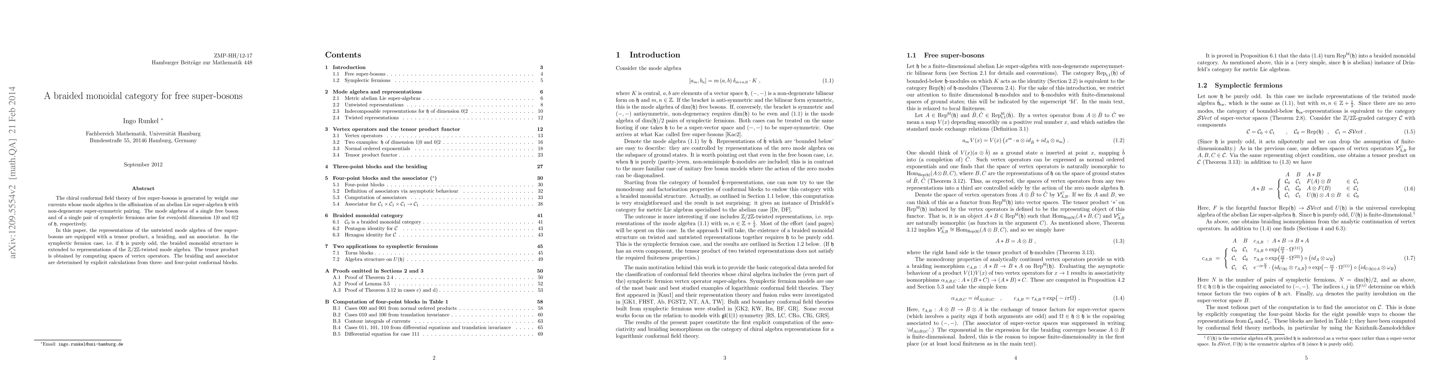 The chiral conformal field theory of free super-bosons is generated by weight one currents whose mode algebra is the affinisation of an abelian Lie super-algebra h with non-degenerate super-symmetric pairing. The mode algebras of a single free boson and of a single pair of symplectic fermions arise for even|odd dimension 1|0 and 0|2 of h, respectively. In this paper, the representations of the untwisted mode algebra of free super-bosons are equipped with a tensor product, a braiding, and an associator. In the symplectic fermion case, i.e. if h is purely odd, the braided monoidal structure is extended to representations of the Z/2Z-twisted mode algebra. The tensor product is obtained by computing spaces of vertex operators. The braiding and associator are determined by explicit calculations from three- and four-point conformal blocks.