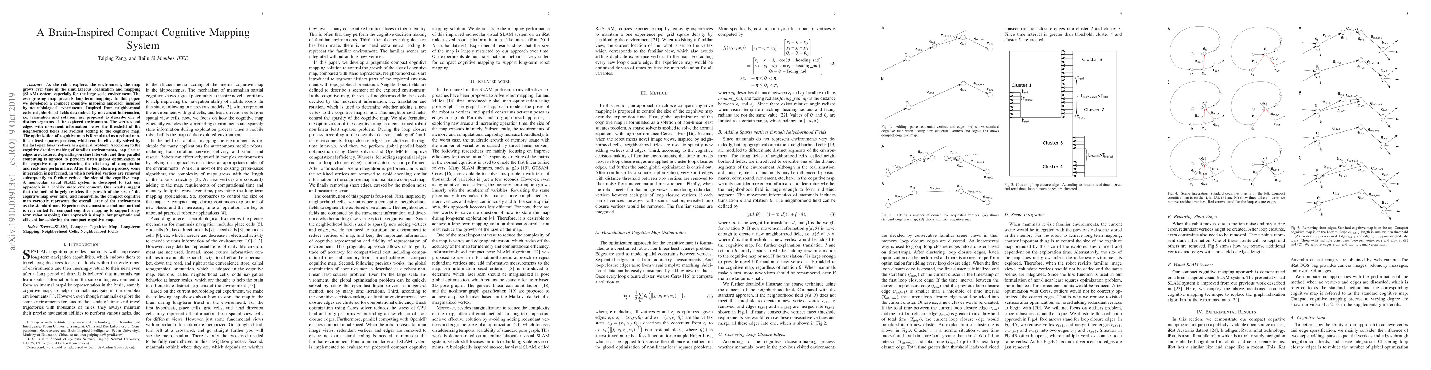 This paper proposes a brain-inspired compact cognitive mapping system for robots, using neighborhood fields to describe segments of the environment and avoiding unnecessary additions to the map. The method employs robust non-linear least squares optimization for efficient computation and parallel computing to ensure real-time performance, ultimately resulting in a significantly reduced cognitive map size while maintaining accurate environment representation.