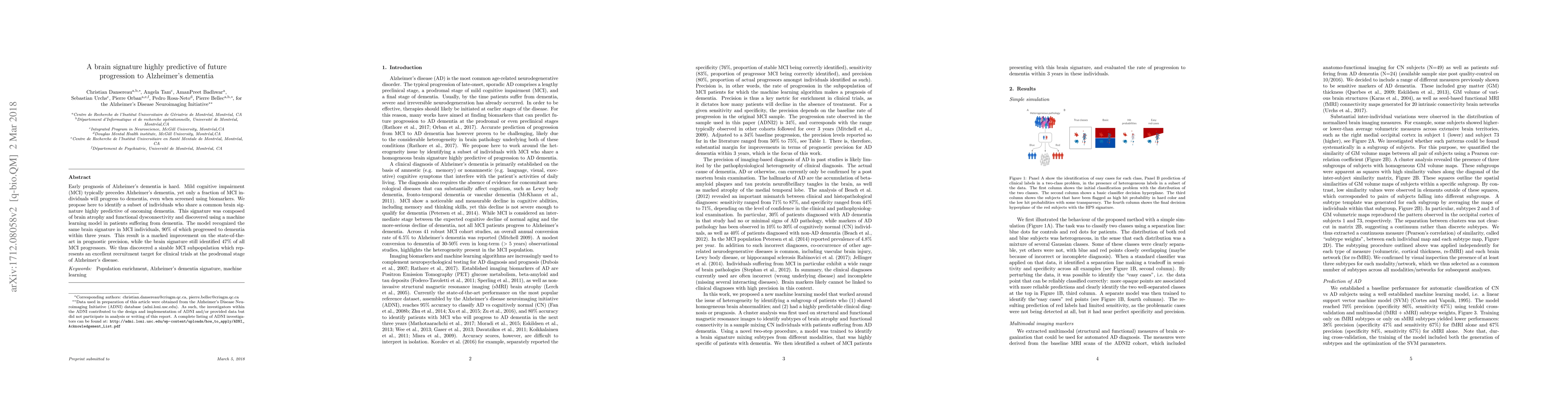 Early prognosis of Alzheimer's dementia is hard. Mild cognitive impairment (MCI) typically precedes Alzheimer's dementia, yet only a fraction of MCI individuals will progress to dementia, even when screened using biomarkers. We propose here to identify a subset of individuals who share a common brain signature highly predictive of oncoming dementia. This signature was composed of brain atrophy and functional dysconnectivity and discovered using a machine learning model in patients suffering from dementia. The model recognized the same brain signature in MCI individuals, 90% of which progressed to dementia within three years. This result is a marked improvement on the state-of-the-art in prognostic precision, while the brain signature still identified 47% of all MCI progressors. We thus discovered a sizable MCI subpopulation which represents an excellent recruitment target for clinical trials at the prodromal stage of Alzheimer's disease.
