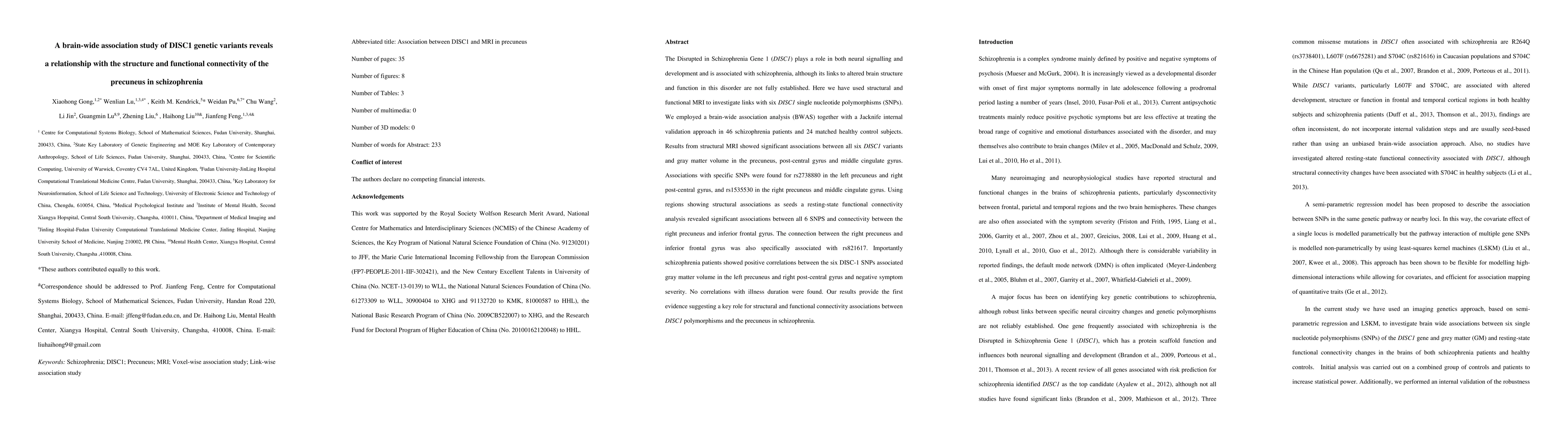 The Disrupted in Schizophrenia Gene 1 (DISC1) plays a role in both neural signalling and development and is associated with schizophrenia, although its links to altered brain structure and function in this disorder are not fully established. Here we have used structural and functional MRI to investigate links with six DISC1 single nucleotide polymorphisms (SNPs). We employed a brain-wide association analysis (BWAS) together with a Jacknife internal validation approach in 46 schizophrenia patients and 24 matched healthy control subjects. Results from structural MRI showed significant associations between all six DISC1 variants and gray matter volume in the precuneus, post-central gyrus and middle cingulate gyrus. Associations with specific SNPs were found for rs2738880 in the left precuneus and right post-central gyrus, and rs1535530 in the right precuneus and middle cingulate gyrus. Using regions showing structural associations as seeds a resting-state functional connectivity analysis revealed significant associations between all 6 SNPS and connectivity between the right precuneus and inferior frontal gyrus. The connection between the right precuneus and inferior frontal gyrus was also specifically associated with rs821617. Importantly schizophrenia patients showed positive correlations between the six DISC-1 SNPs associated gray matter volume in the left precuneus and right post-central gyrus and negative symptom severity. No correlations with illness duration were found. Our results provide the first evidence suggesting a key role for structural and functional connectivity associations between DISC1 polymorphisms and the precuneus in schizophrenia.