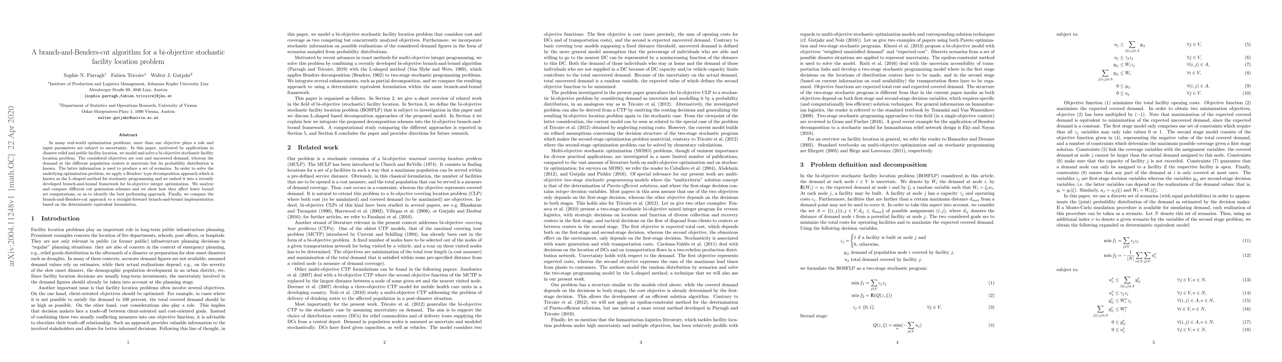 A novel algorithm combining branch-and-bound with Benders' cut is proposed for solving bi-objective stochastic facility location problems, improving upon a traditional branch-and-bound approach by effectively handling uncertainty.