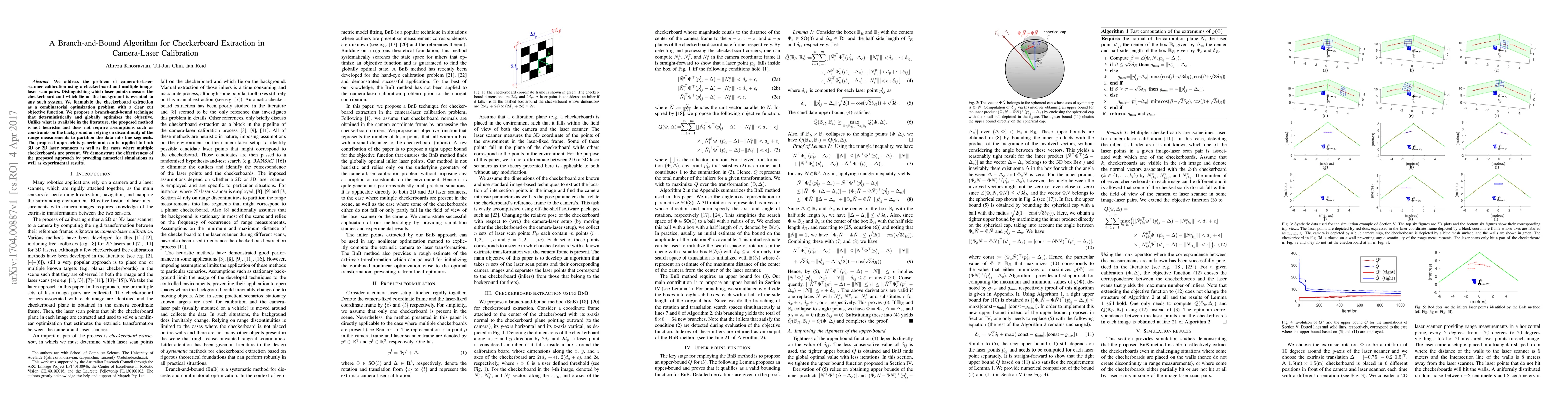 This paper proposes a branch-and-bound algorithm for extracting checkerboards in camera-laser calibration, addressing the challenge of distinguishing laser points that measure the checkerboard from those on the background. The method is deterministic, global, and applicable to both 3D and 2D laser scanners without relying on heuristic assumptions or background constraints.