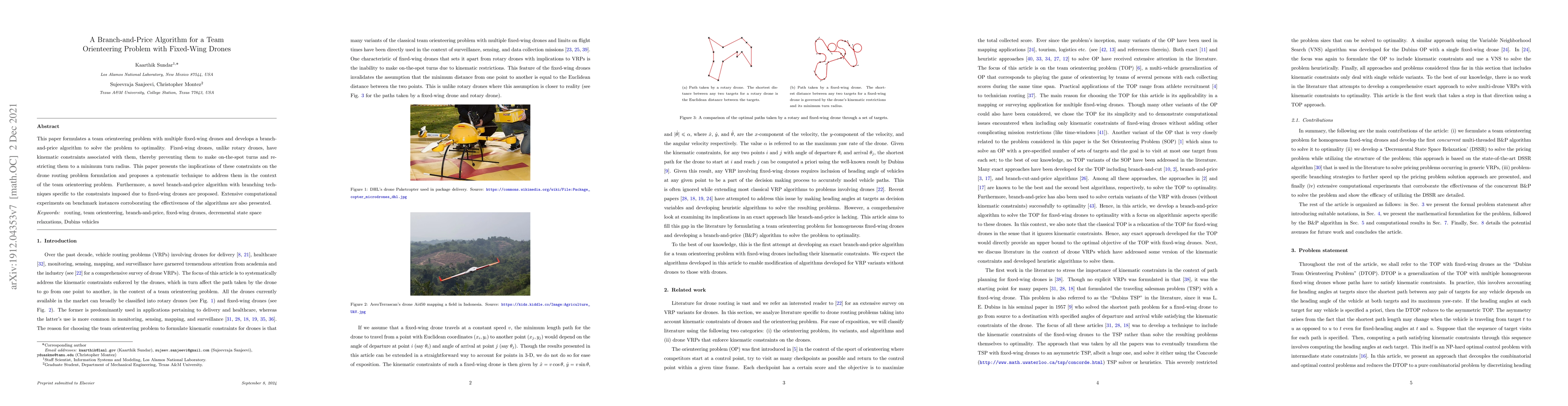 This paper formulates a team orienteering problem with multiple fixed-wing drones and develops a branch-and-price algorithm to solve the problem to optimality. Fixed-wing drones, unlike rotary drones, have kinematic constraints associated with them, thereby preventing them to make on-the-spot turns and restricting them to a minimum turn radius. This paper presents the implications of these constraints on the drone routing problem formulation and proposes a systematic technique to address them in the context of the team orienteering problem. Furthermore, a novel branch-and-price algorithm with branching techniques specific to the constraints imposed due to fixed-wing drones are proposed. Extensive computational experiments on benchmark instances corroborating the effectiveness of the algorithms are also presented.