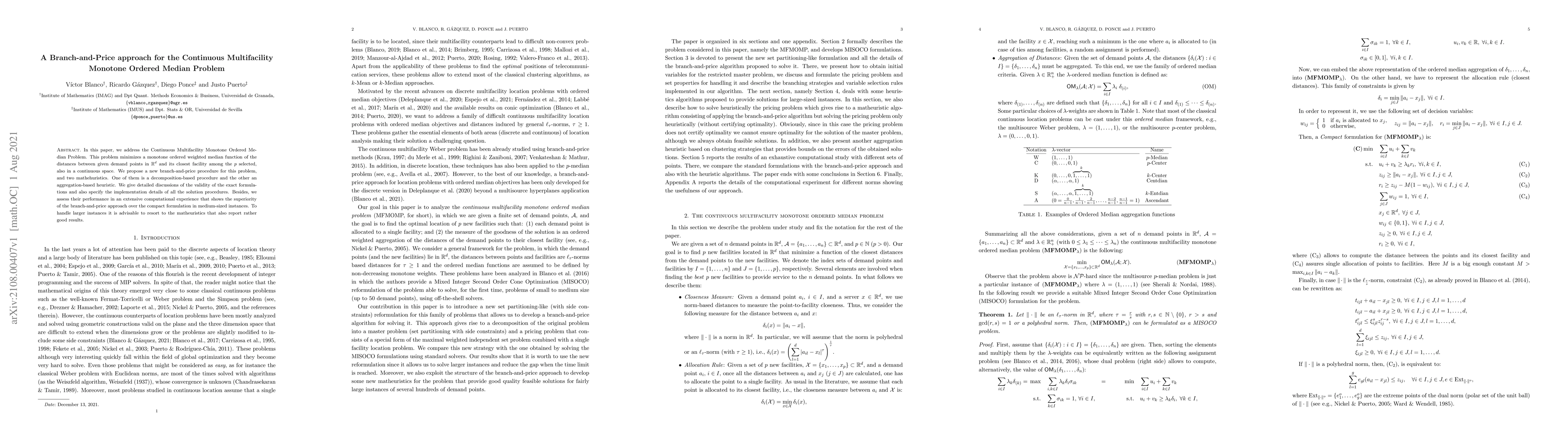 This paper proposes a branch-and-price approach for solving the Continuous Multifacility Monotone Ordered Median Problem, which minimizes a weighted median function of distances between demand points and selected facilities. The study also introduces decomposition and aggregation-based heuristics, demonstrating the effectiveness of the branch-and-price method for medium-sized instances and the heuristics for larger ones.