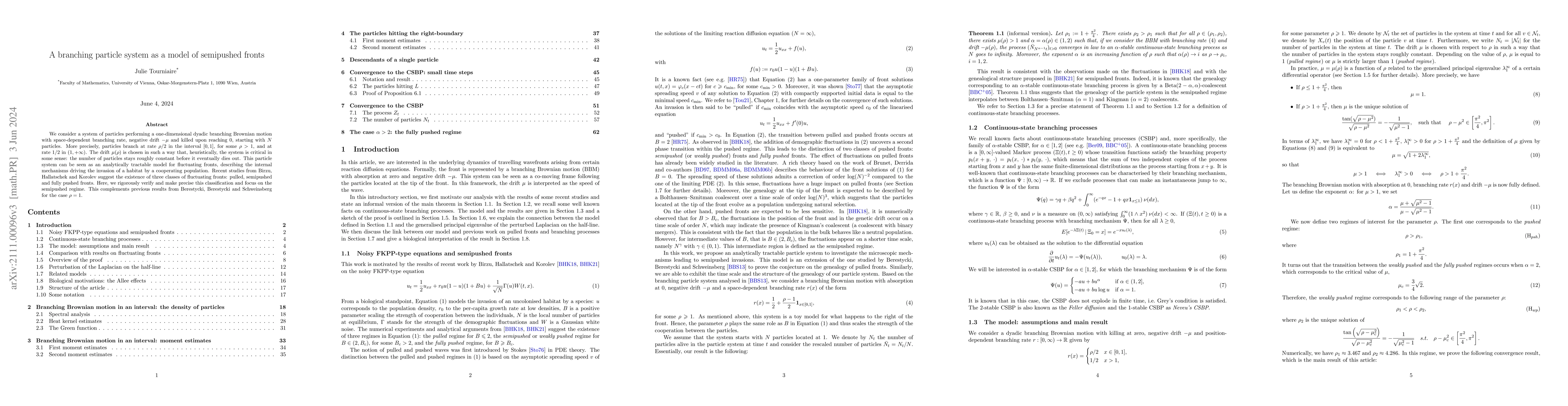 This paper models semipushed fronts using a branching particle system with space-dependent branching rates and negative drift. It rigorously verifies the classification of fluctuating fronts into pulled, semipushed, and pushed regimes, proving the existence of two critical values and an $\alpha$-stable continuous-state branching process for the semipushed regime.