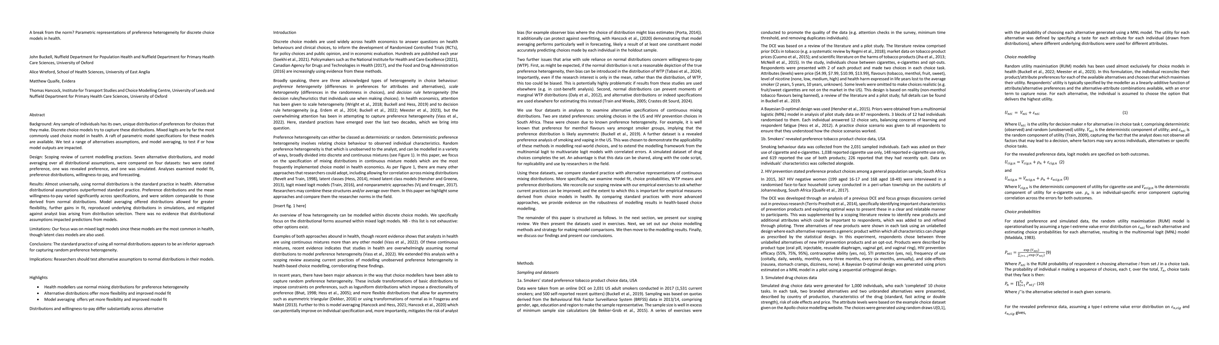 Background: Any sample of individuals has its own, unique distribution of preferences for choices that they make. Discrete choice models try to capture these distributions. Mixed logits are by far the most commonly used choice model in health. A raft of parametric model specifications for these models are available. We test a range of alternatives assumptions, and model averaging, to test if or how model outputs are impacted. Design: Scoping review of current modelling practices. Seven alternative distributions, and model averaging over all distributional assumptions, were compared on four datasets: two were stated preference, one was revealed preference, and one was simulated. Analyses examined model fit, preference distributions, willingness-to-pay, and forecasting. Results: Almost universally, using normal distributions is the standard practice in health. Alternative distributional assumptions outperformed standard practice. Preference distributions and the mean willingness-to-pay varied significantly across specifications, and were seldom comparable to those derived from normal distributions. Model averaging offered distributions allowed for greater flexibility, further gains in fit, reproduced underlying distributions in simulations, and mitigated against analyst bias arising from distribution selection. There was no evidence that distributional assumptions impacted predictions from models. Limitations: Our focus was on mixed logit models since these models are the most common in health, though latent class models are also used. Conclusions: The standard practice of using all normal distributions appears to be an inferior approach for capturing random preference heterogeneity. Implications: Researchers should test alternative assumptions to normal distributions in their models.