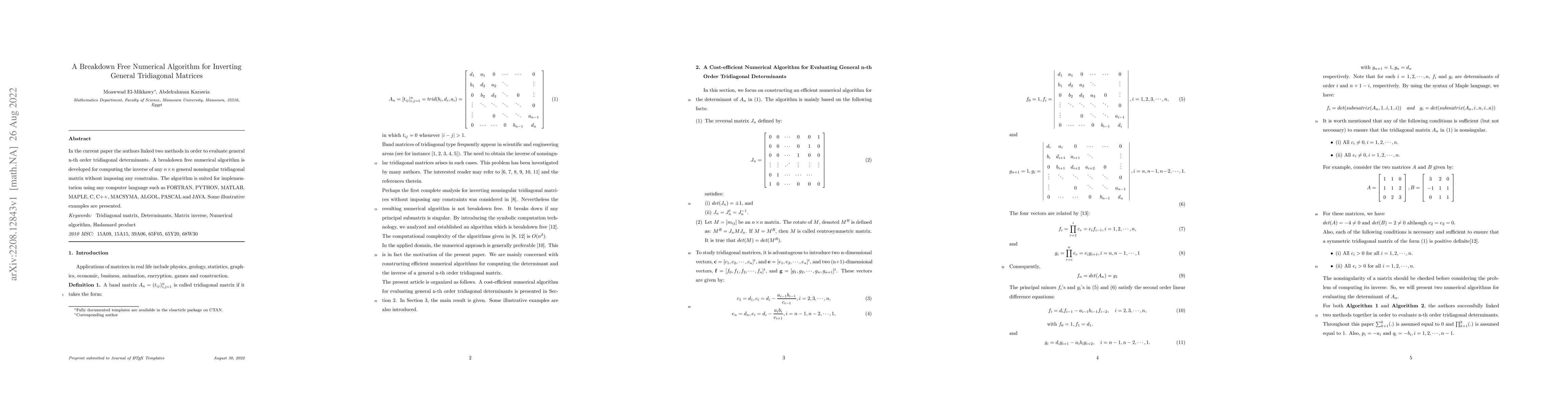 This paper presents a breakdown-free numerical algorithm for inverting general n-x-n nonsingular tridiagonal matrices, combining two methods to compute determinants without constraints. The algorithm is versatile and can be implemented in various programming languages.