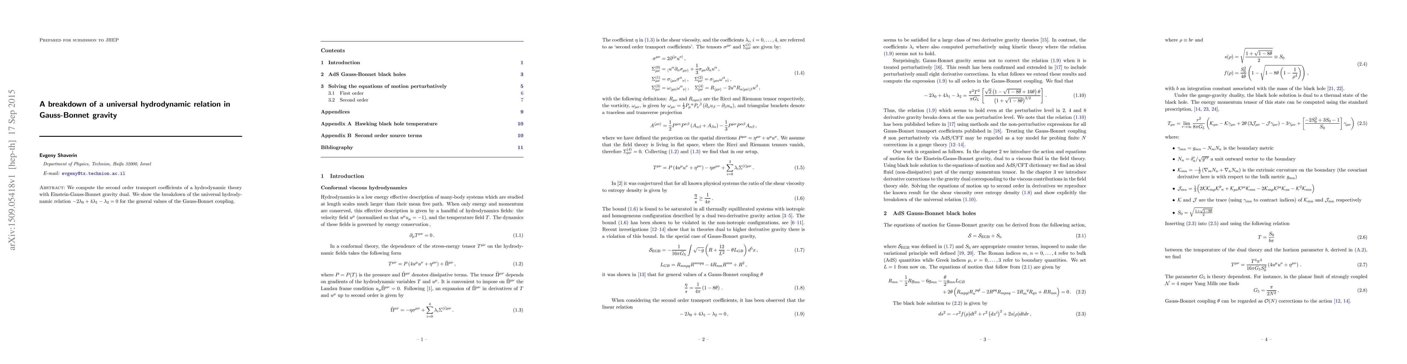 We compute the second order transport coefficients of a hydrodynamic theory with Einstein-Gauss-Bonnet gravity dual. We show the breakdown of the universal hydrodynamic relation $ -2 \lambda_0 + 4 \lambda_1 - \lambda_2 = 0 $ for the general values of the Gauss-Bonnet coupling.