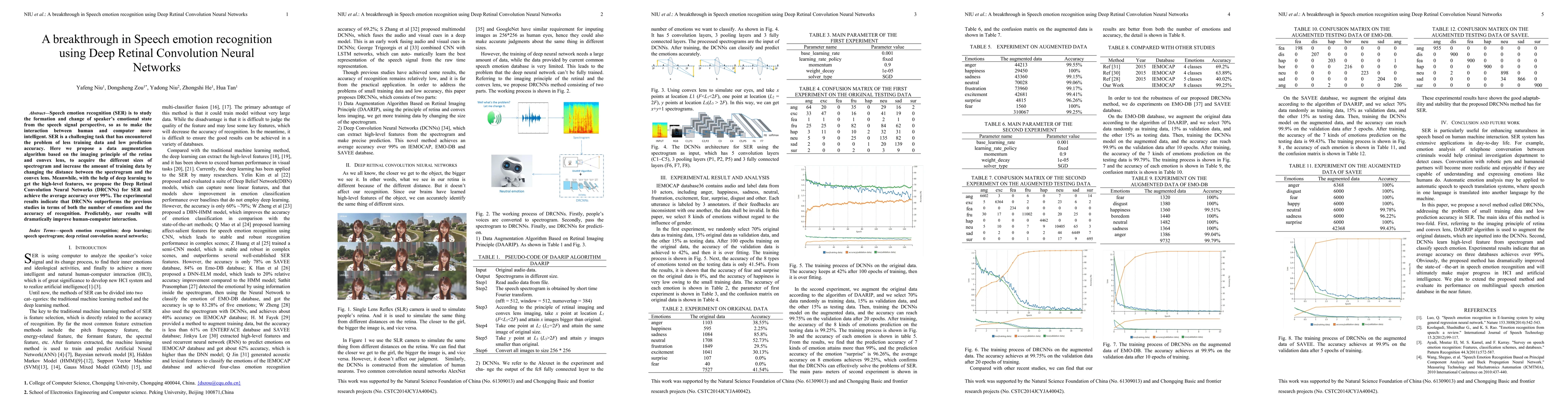 This paper proposes Deep Retinal Convolutional Neural Networks (DRCNNs) for speech emotion recognition, utilizing a data augmentation technique inspired by the retina's imaging principle to enhance training data. The DRCNNs achieve an average recognition accuracy over 99%, significantly outperforming previous methods and promising improved human-computer interaction.