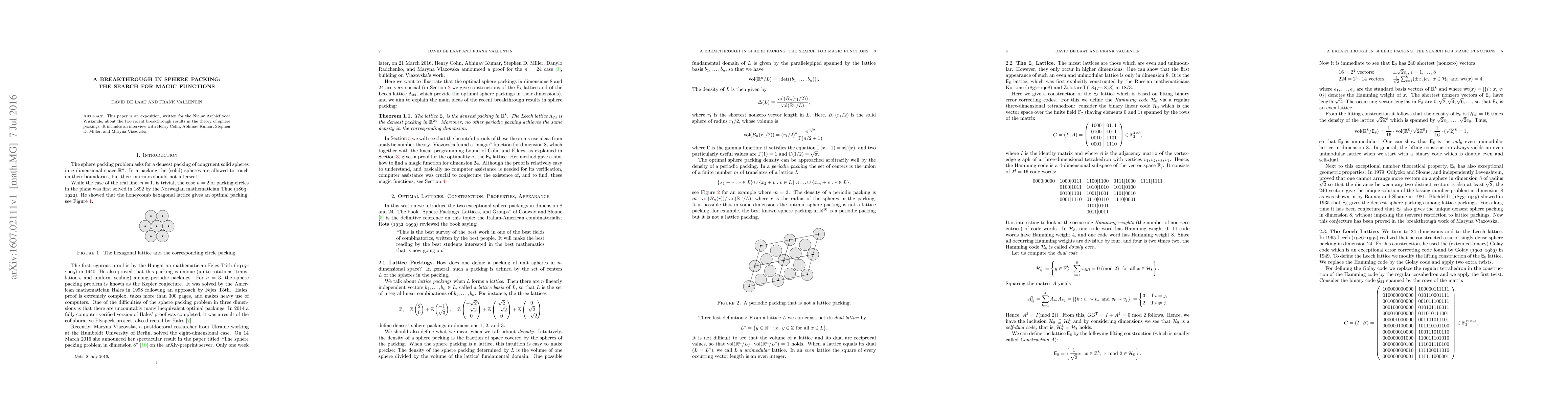 This paper is an exposition, written for the Nieuw Archief voor Wiskunde, about the two recent breakthrough results in the theory of sphere packings. It includes an interview with Henry Cohn, Abhinav Kumar, Stephen D. Miller, and Maryna Viazovska.