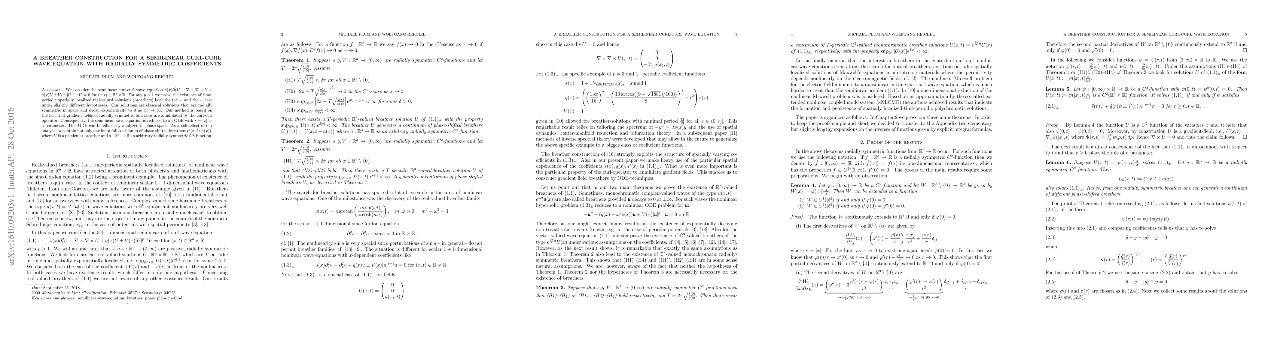 This paper proves the existence of time-periodic, spatially localized, radially symmetric solutions (breathers) for a semilinear curl-curl wave equation with radially symmetric coefficients. The method reduces the problem to an ODE, allowing for the analysis of a continuum of phase-shifted breathers.